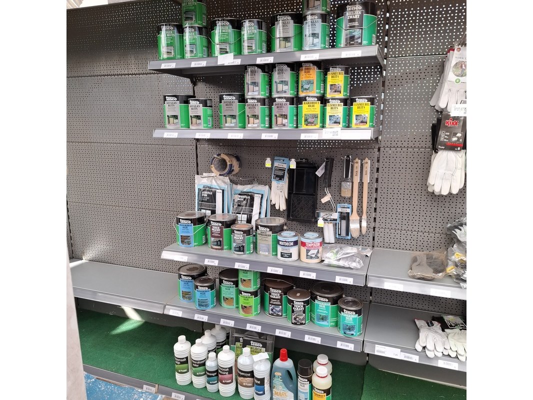 Merk: o.a. Tenco Product: Partij houtbeschermingsmiddelen Specificaties: Bestaande uit o.a. beits, oliën, impregneer, schoonmaakmiddelen etc. In 1 meter stelling.