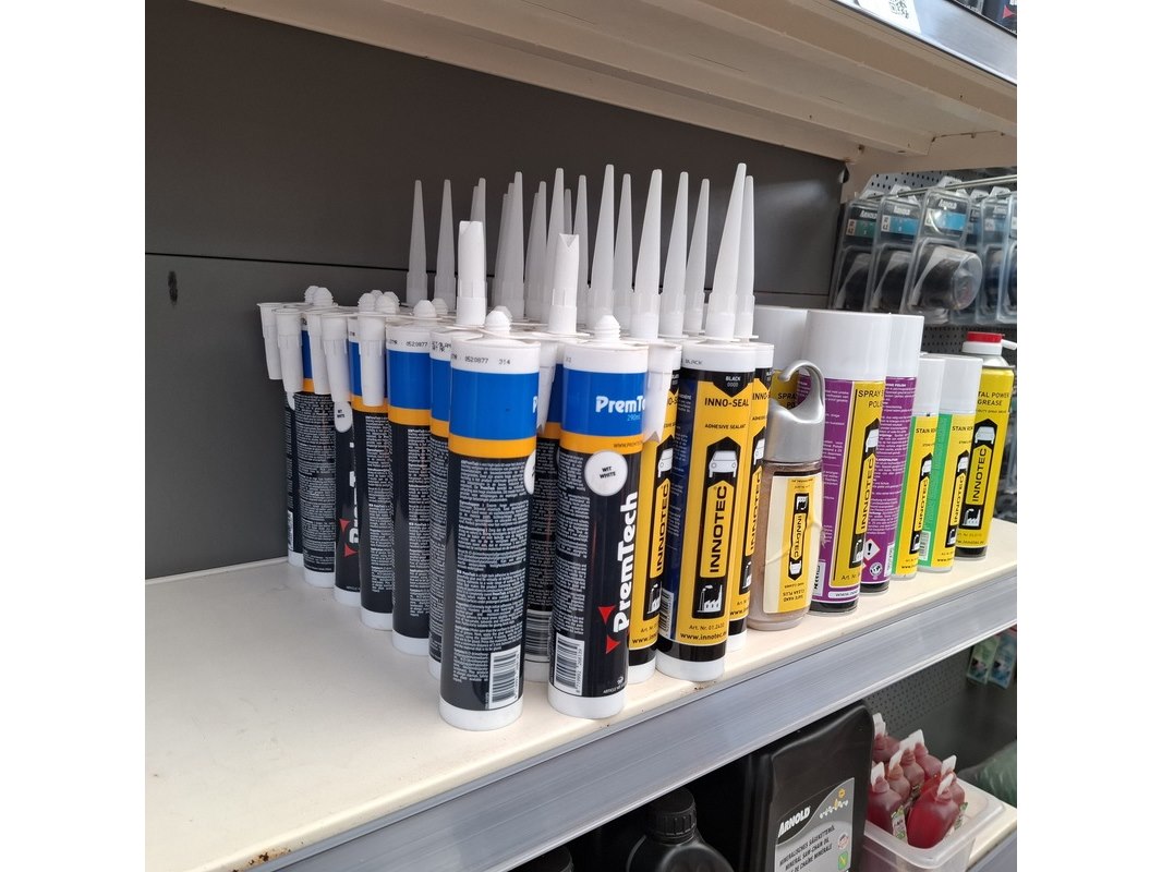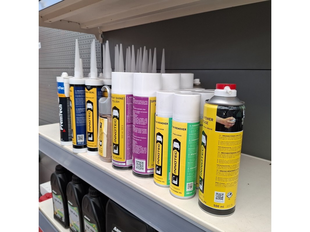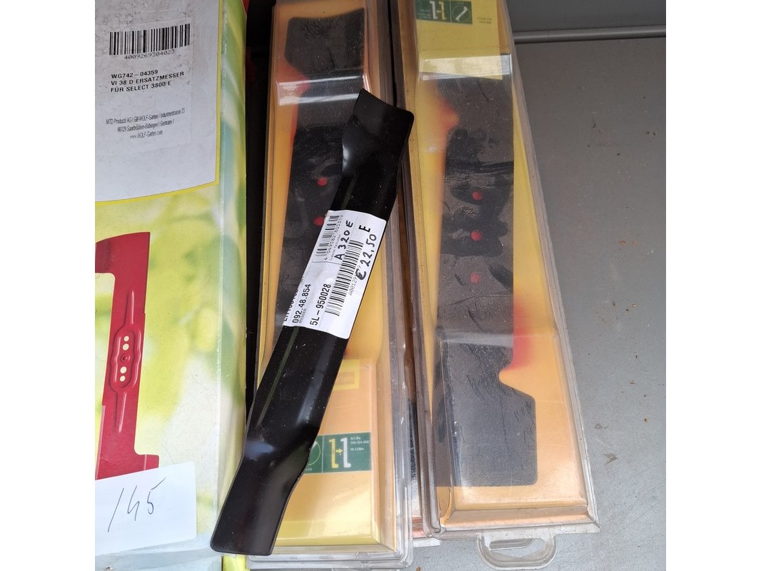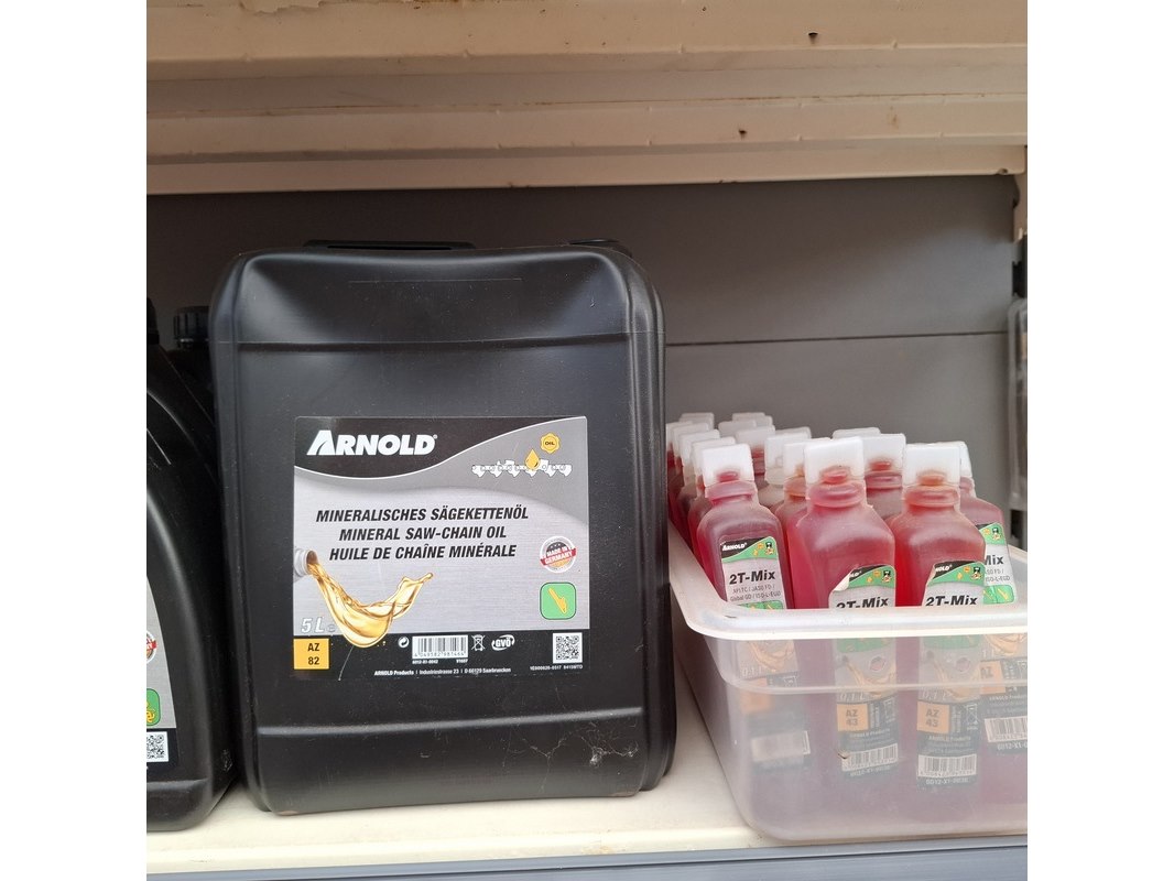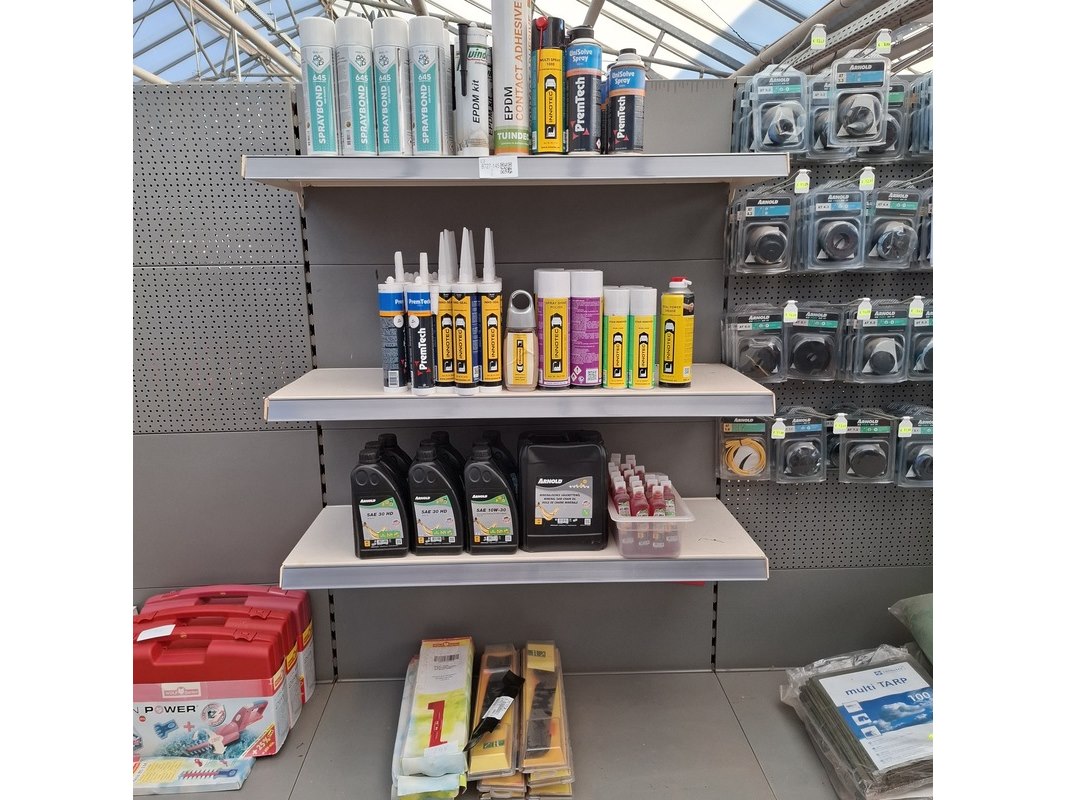Merk: o.a. Arnold, Wolf Garten Product: Partij diversen Specificaties: Bestaande uit o.a. kitten, kettingzaag olie, contactlijm, grasmaaiermessen etc. In 1 meter stelling.