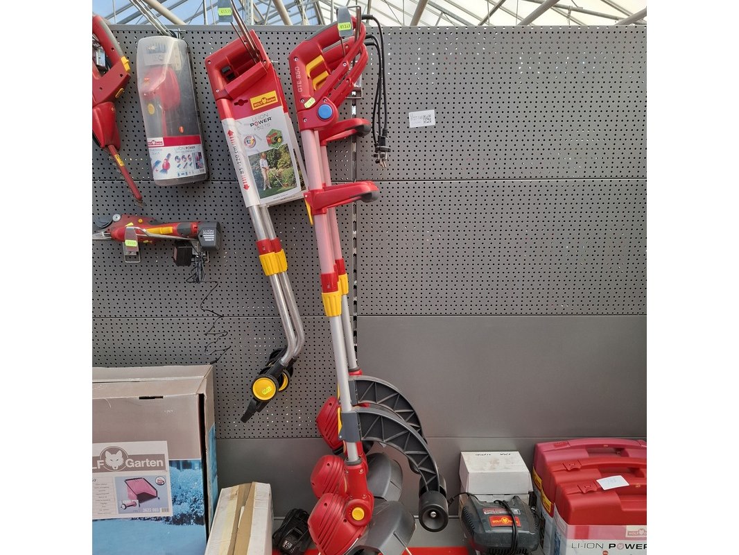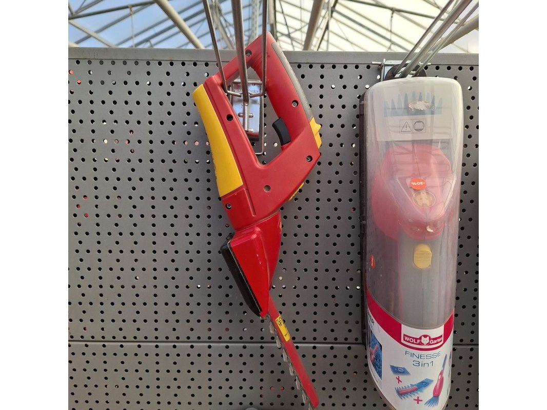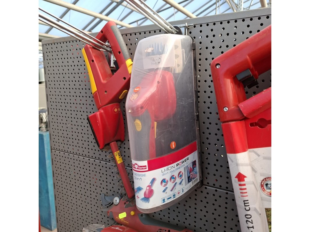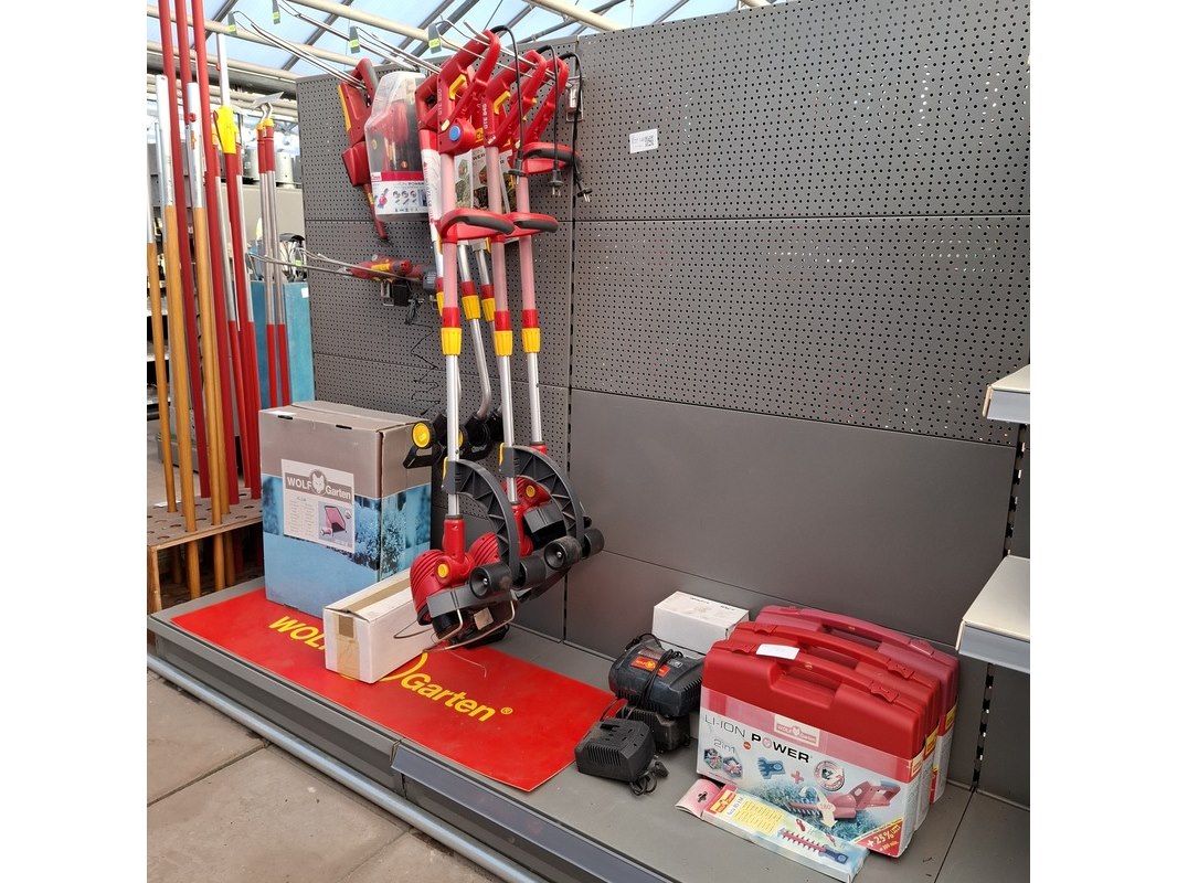 Merk: o.a. Wolf Garten Product: Assortiment elektrisch tuingereedschap Specificaties: Bestaande uit o.a. accu heggenschaar, trimmers, accu takkenknippers, acculaders, blad opvangbak etc. In 2 meter stelling.