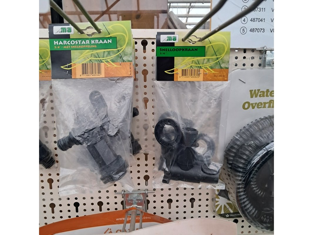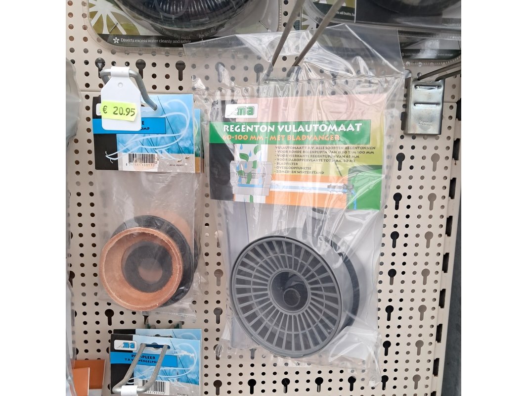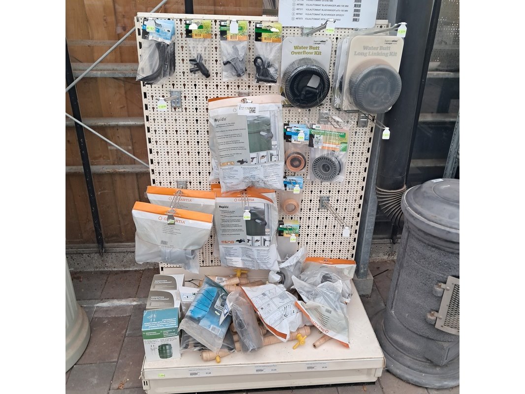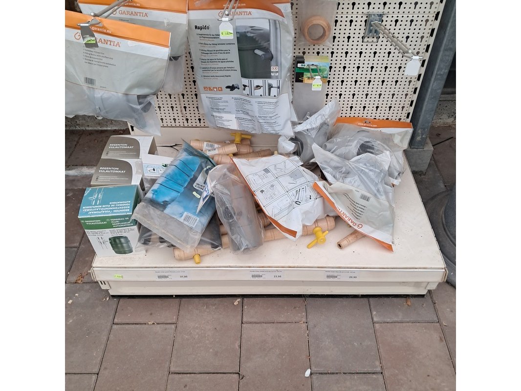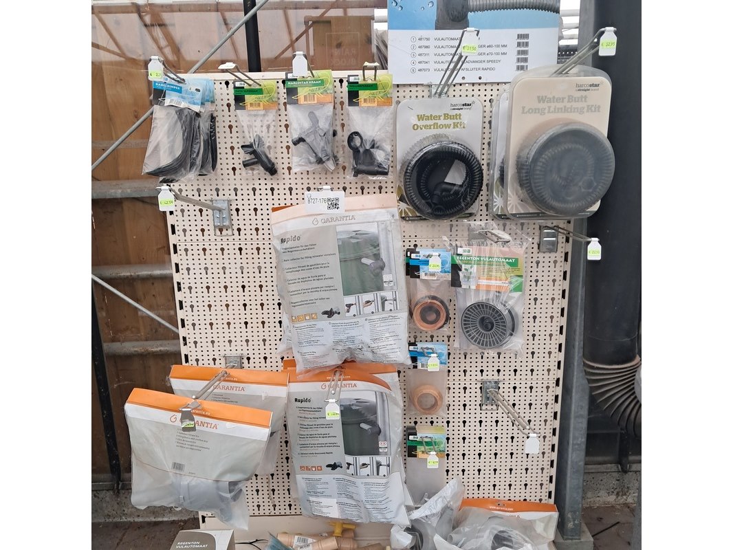 Merk: o.a. Harcostar Product: Assortiment regenton toebehoren Specificaties: Bestaande uit o.a. bladvangers, afsluiters, vulautomaten etc.