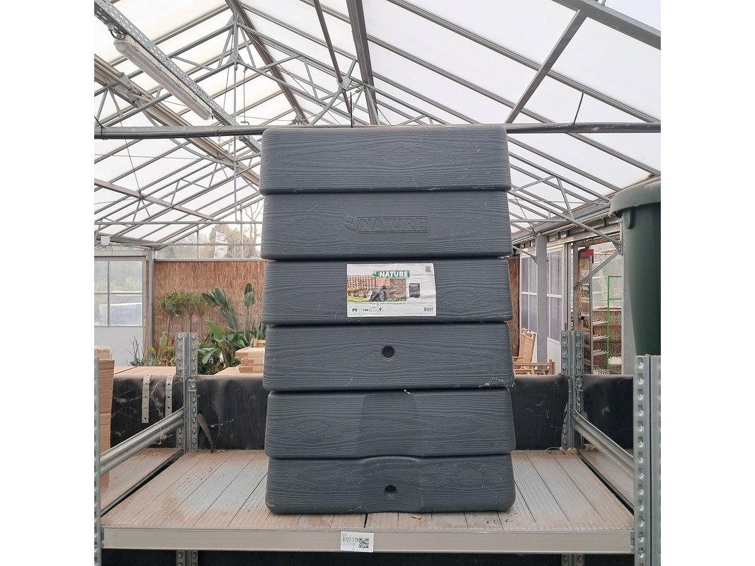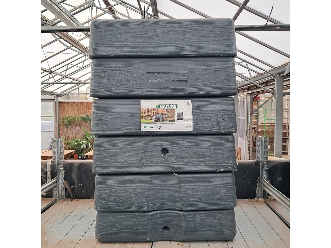 Merk: Nature Product: Regenton en toebehoren Afmeting: Inhoud 168l. Hxbxd ca. 88x59x39 cm. Specificaties: Inclusief diverse regenton verhogingen.