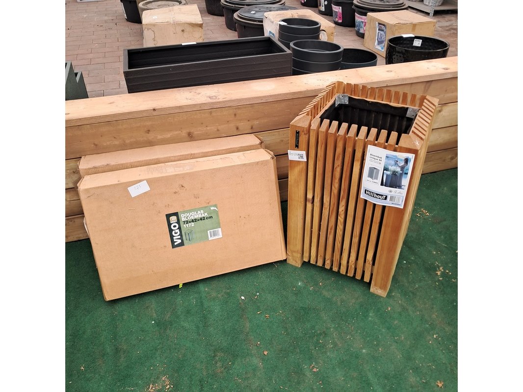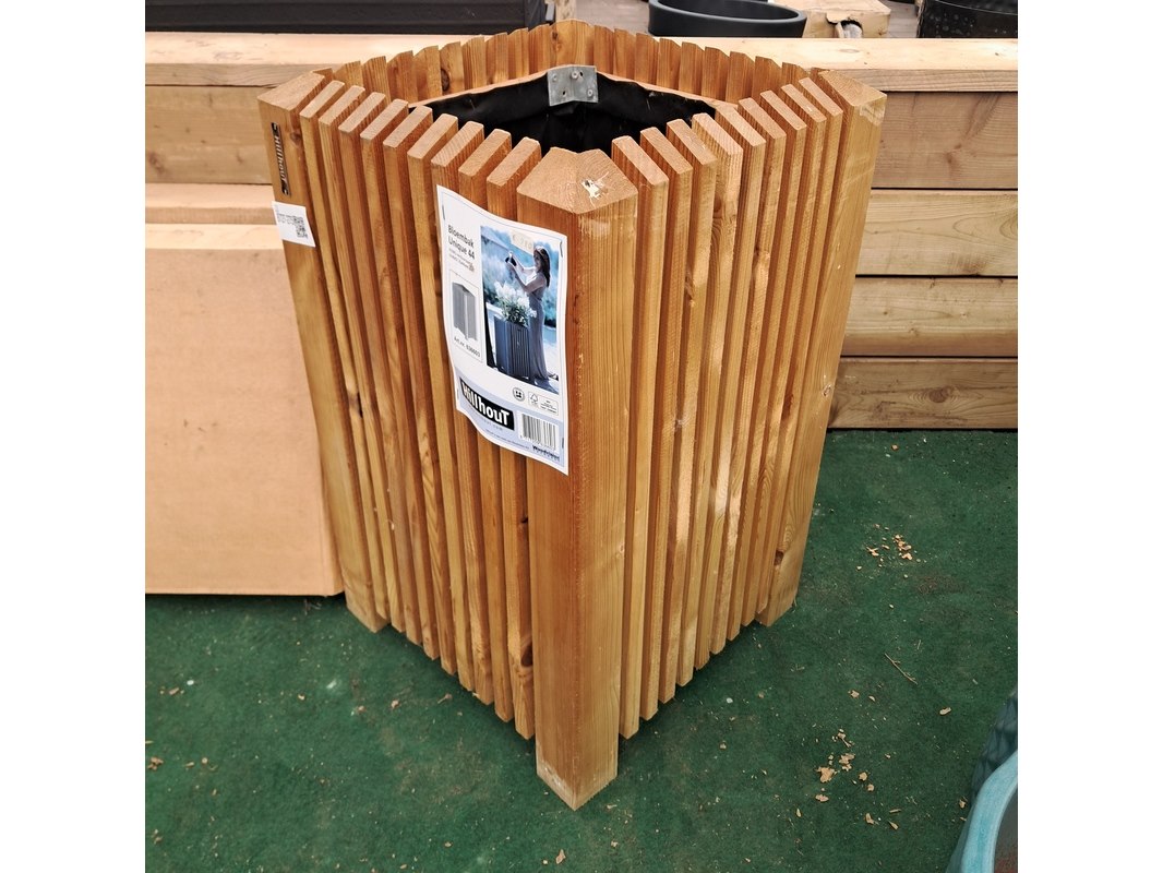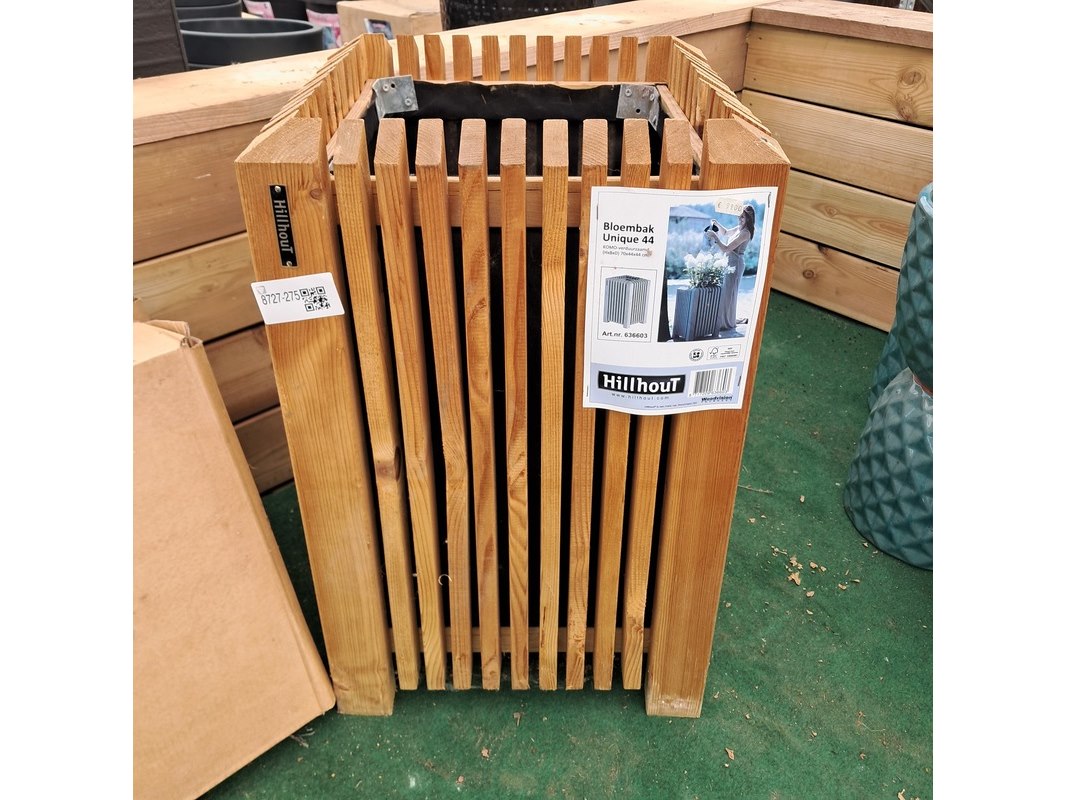Merk: Hillhout, Carp garrant Product: Houten bloembak Afmeting: o.a. hxbxd ca. 72x44x44 cm.