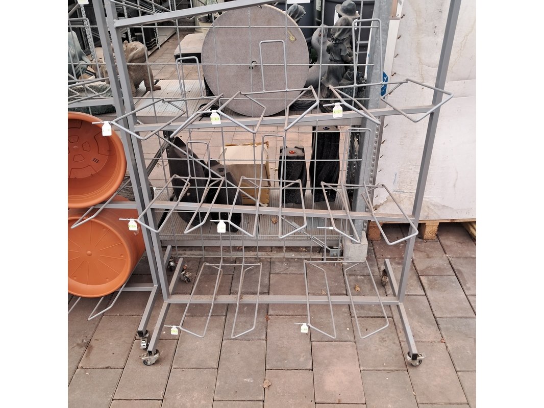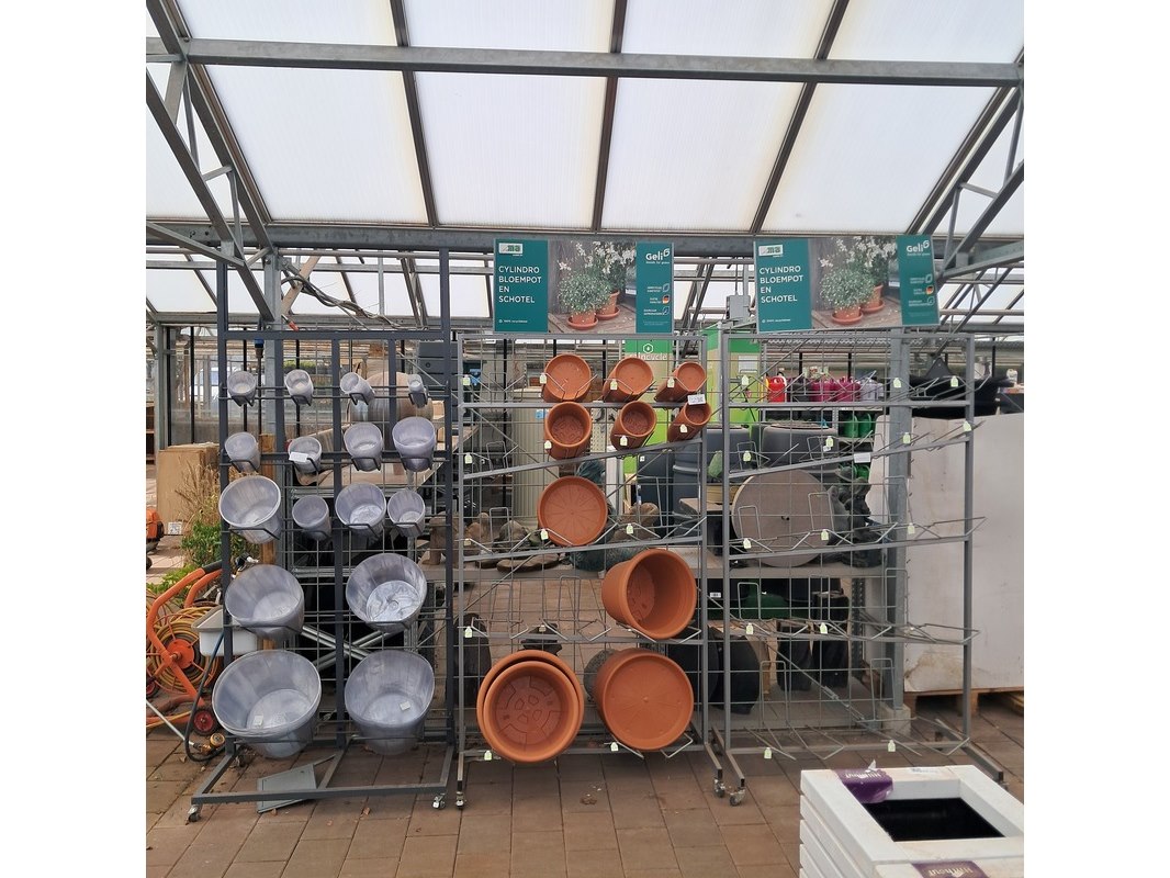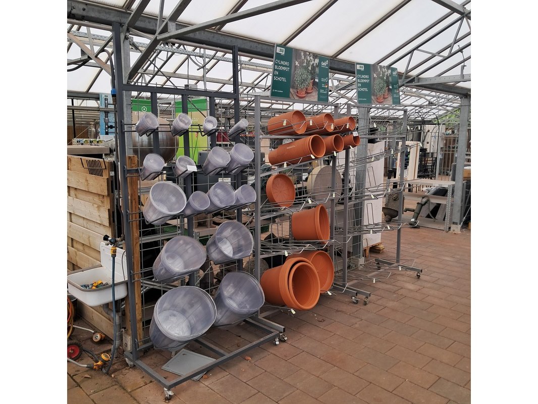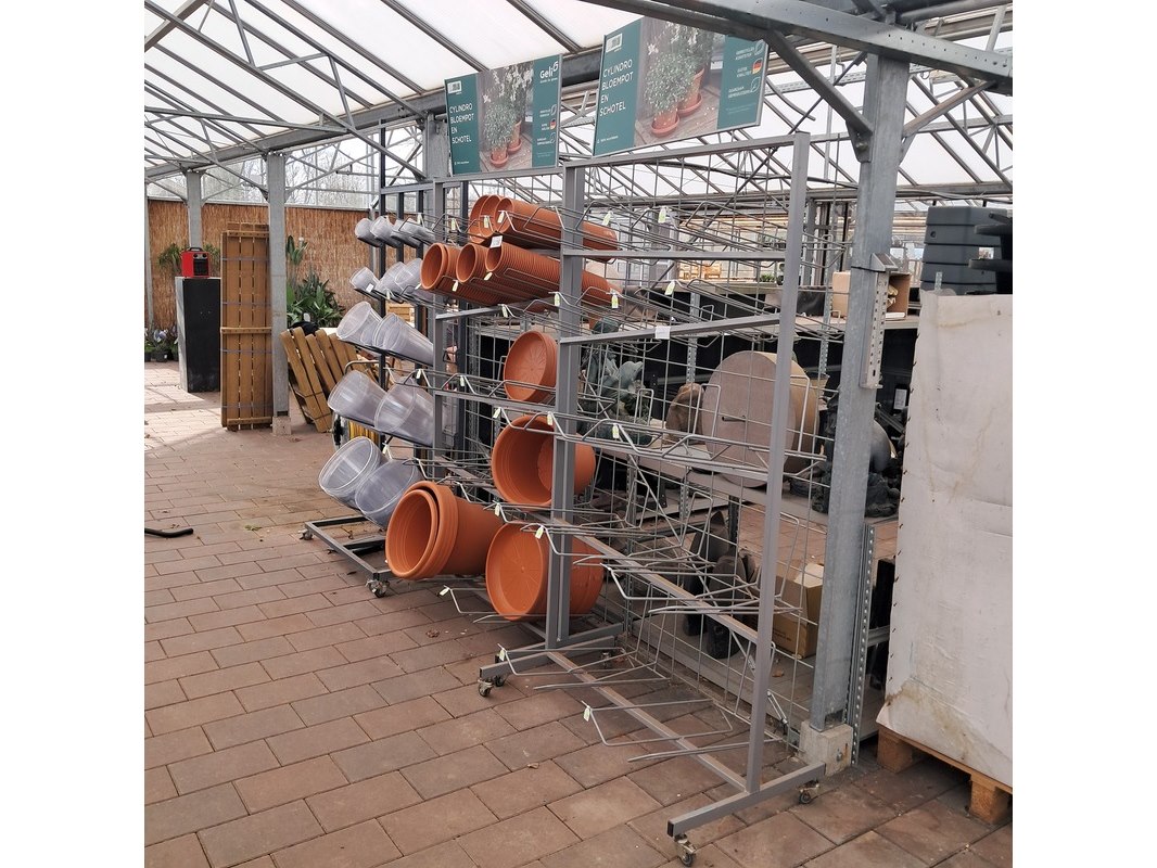 Product: Verrijdbare stelling met inhoud Afmeting: Stelling o.a. hxb ca. 233x110 cm. Specificaties: Inclusief diverse bloempotten en inzetbakken.