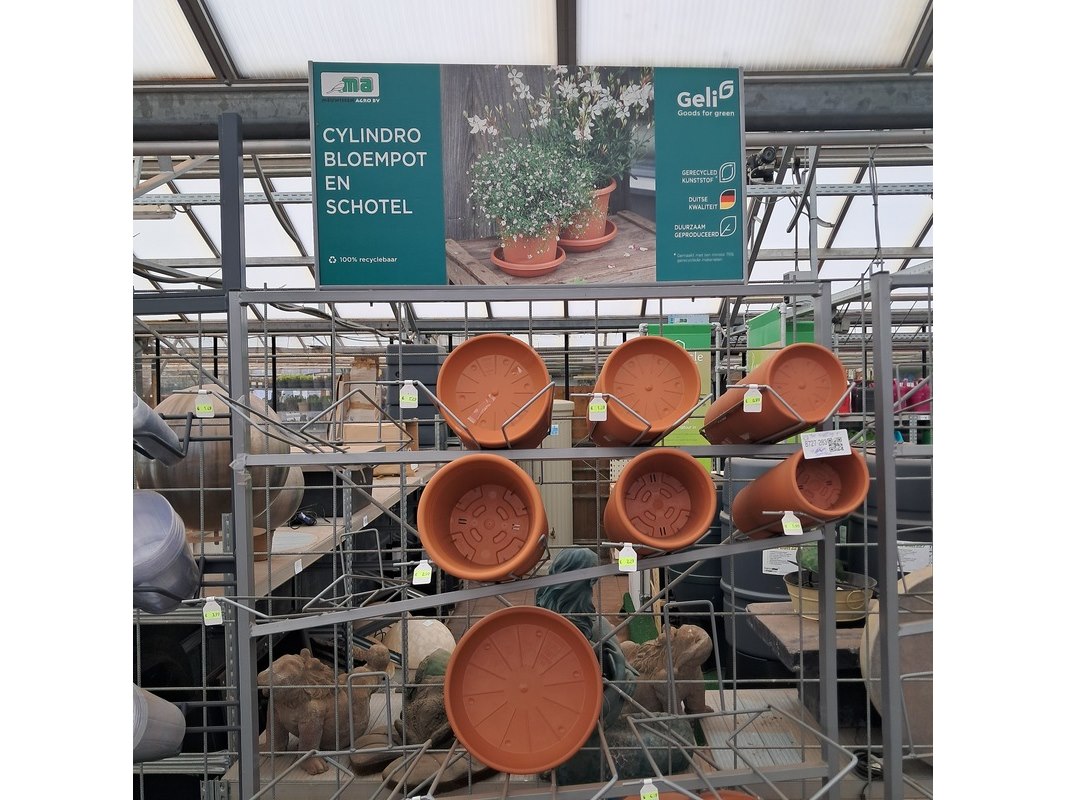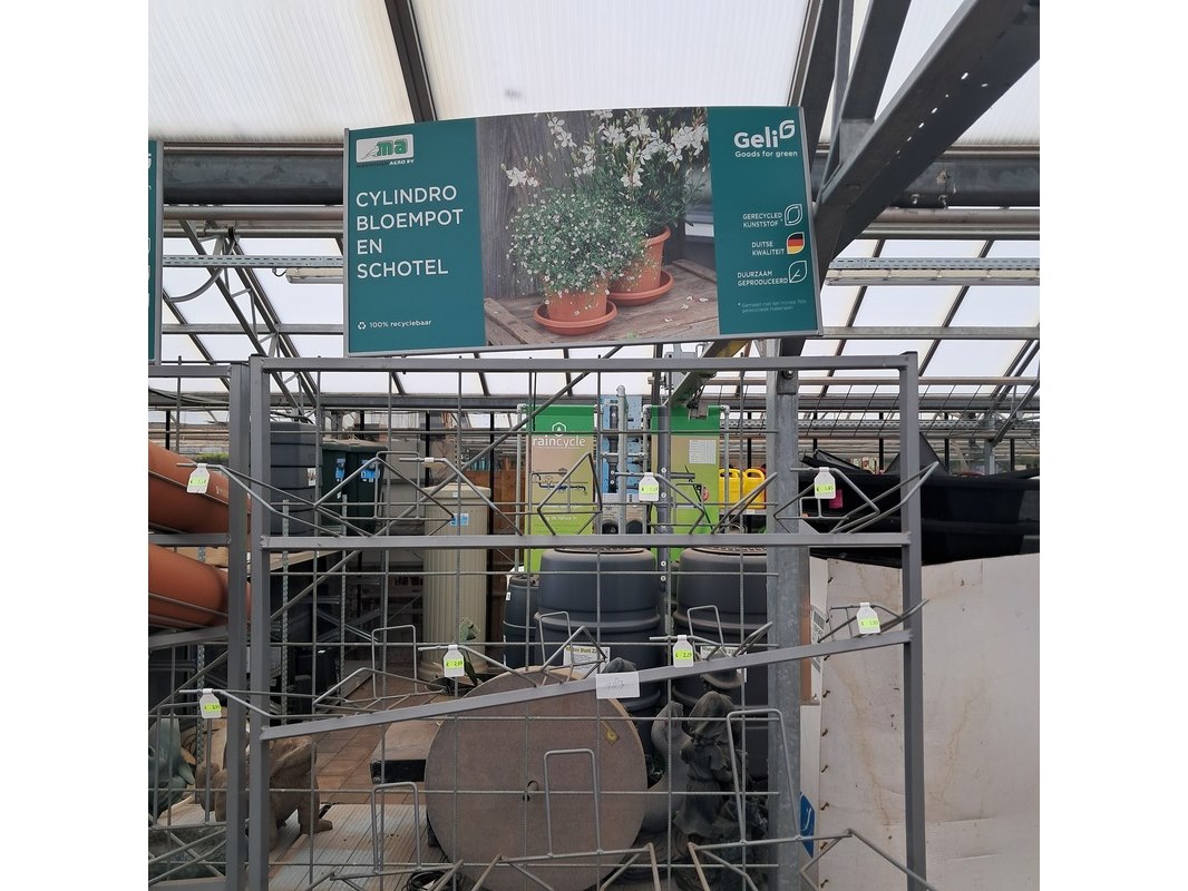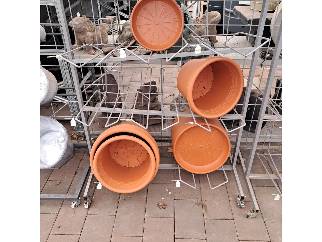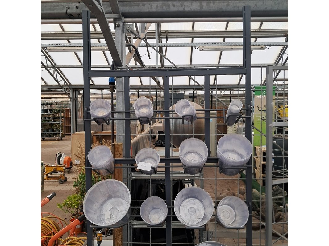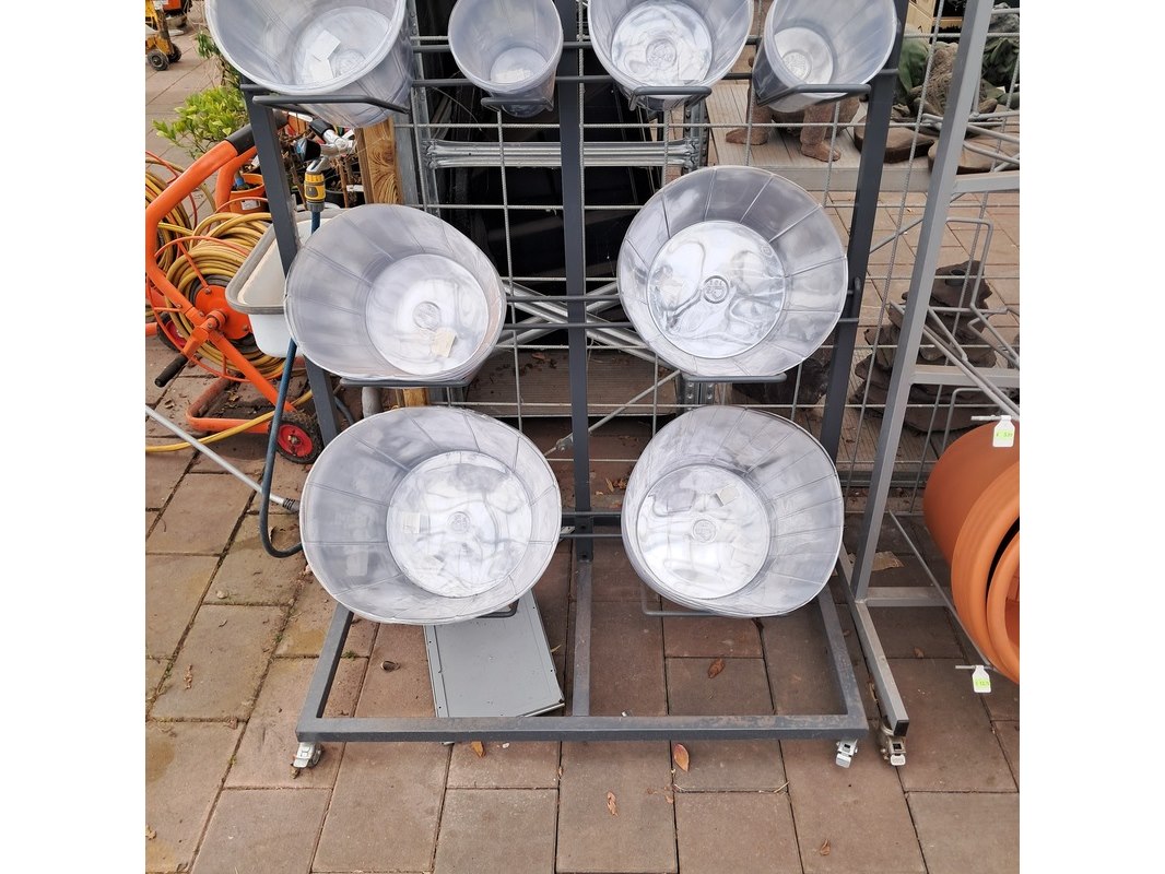Product: Verrijdbare stelling met inhoud Afmeting: Stelling o.a. hxb ca. 233x110 cm. Specificaties: Inclusief diverse bloempotten en inzetbakken.