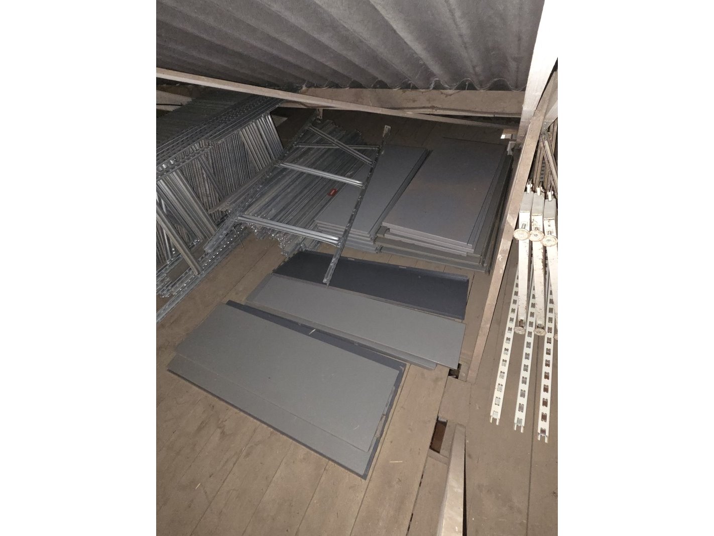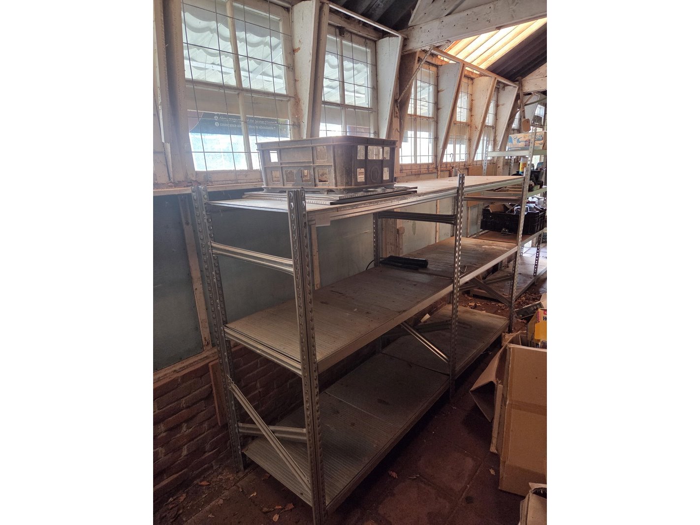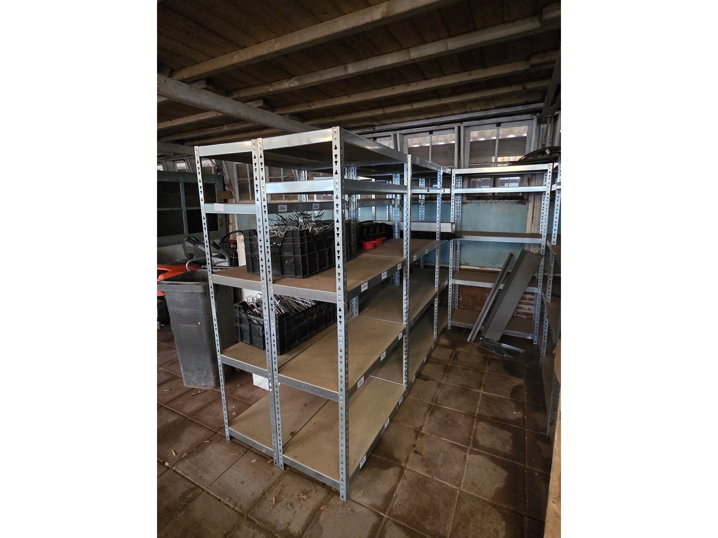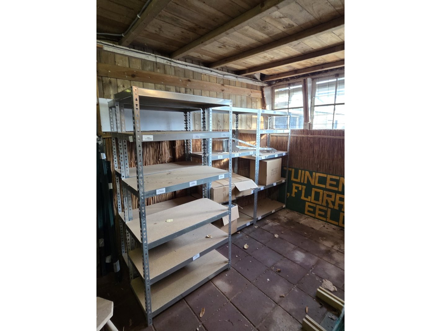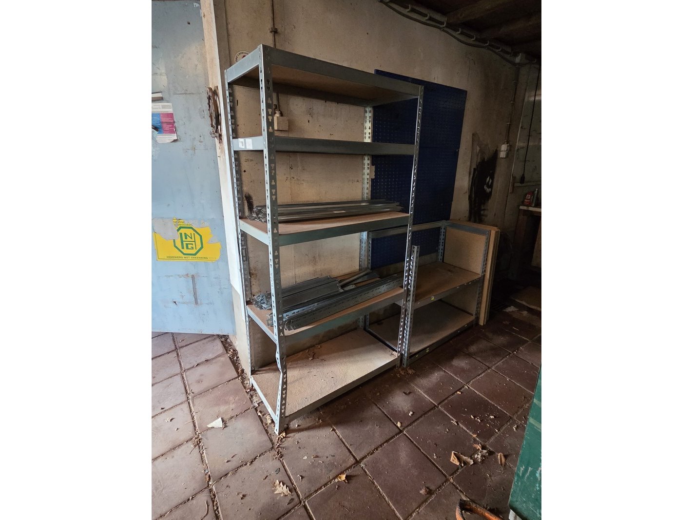 Product: Partij stellingen Specificaties: Bestaande uit o.a. 14x staander hoogte 82 cm, 4x staander hoogte 144 cm, ca. 90x plaat en ca. 30 meter stelling met houten platen. Exclusief inhoud.