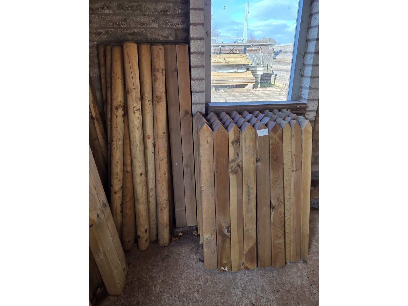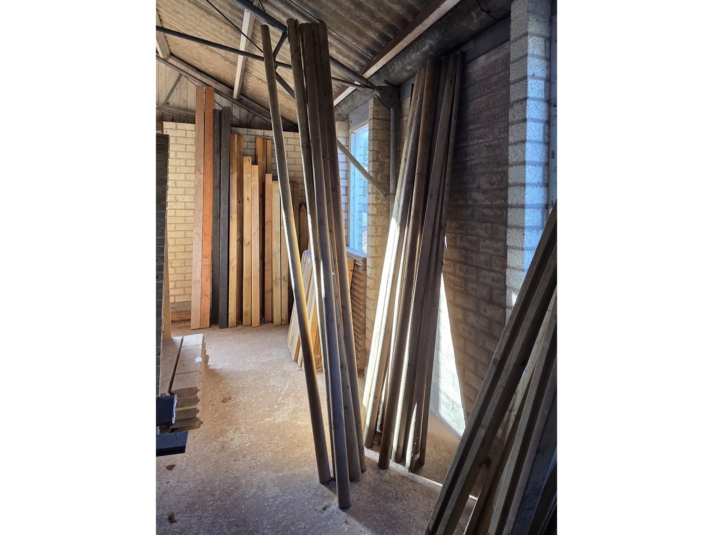 Product: Assortiment tuinhout Specificaties: Bestaande uit o.a. vierkante tuinpalen, piketten, latten, ronde tuinpalen etc.