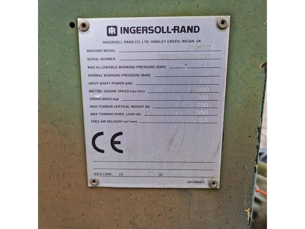 Merk: Ingersoll-Rand Product: Compressor mobiel Conditie: gebruikt Specificaties: Product: mobiele compressor Merk: Ingersoll-Rand Type:P101WD Conditie:gebruikt Afgelezen tellerstand: 1.461 uren Werkdruk: 7 bar Maximaal gewicht: 750kg Start: ja, met externe voeding VIN: 206173E94337