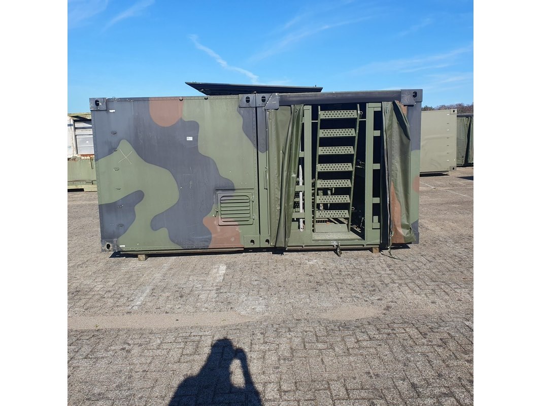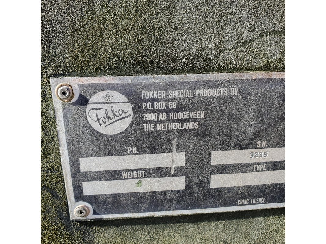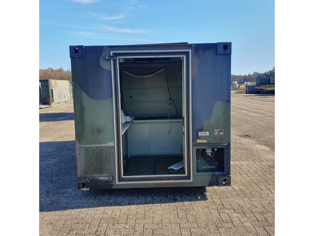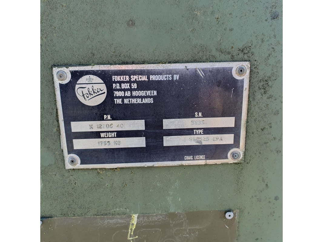 Merk: Fokker Product: Shelter Afmeting: LxBxH ca. 424x218x202 cm. Conditie: gebruikt Specificaties: Gewicht ca. 1753 Kg. Let op, grotendeels casco. Technische staat en compleetheid onbekend. scharnieren van deur defect, deur los meegeleverd