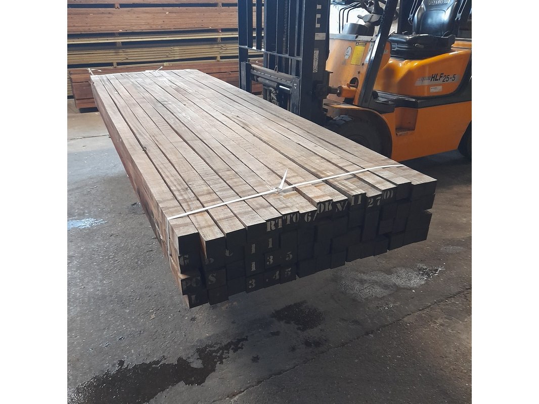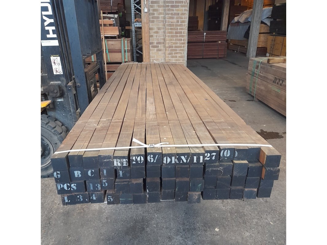Product: Hardhouten paal Materiaal: Okan Afmeting: 7 x 7 x 350 cm Conditie: nieuw