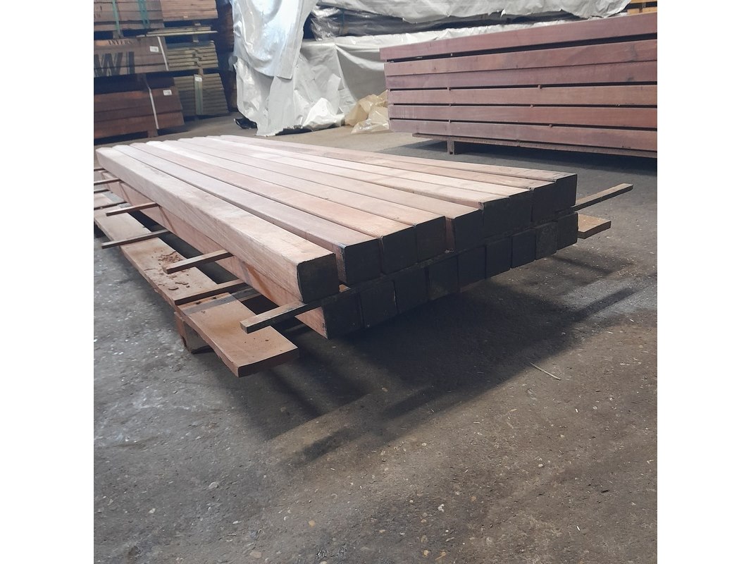 Product: Hardhouten paal Materiaal: Angelim Vermelho Afmeting: 6,8 x 6,8 x 200 cm Conditie: nieuw