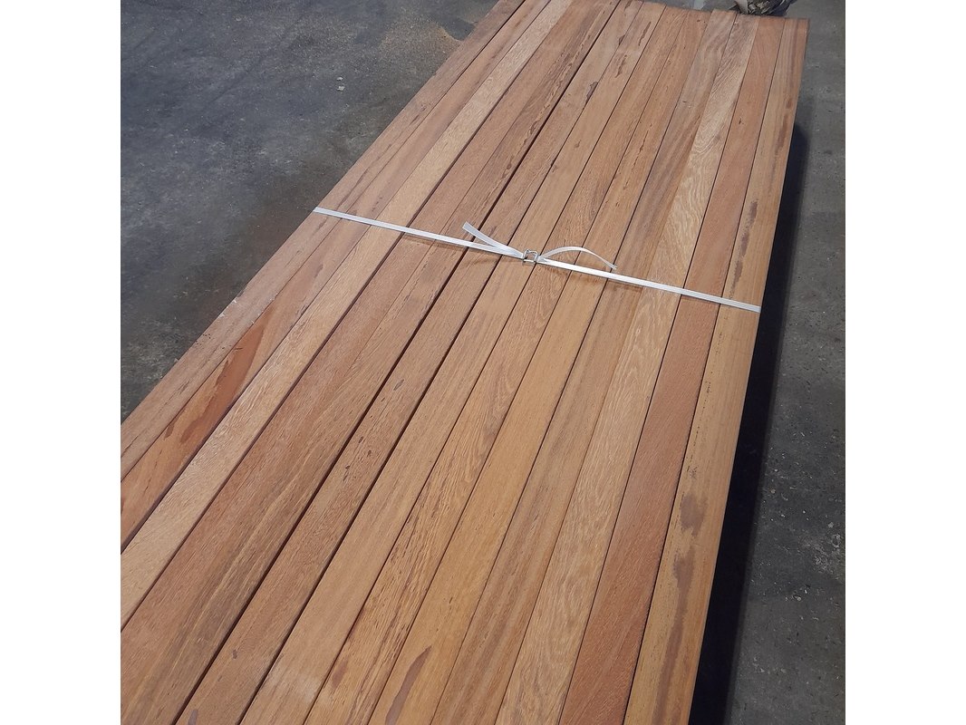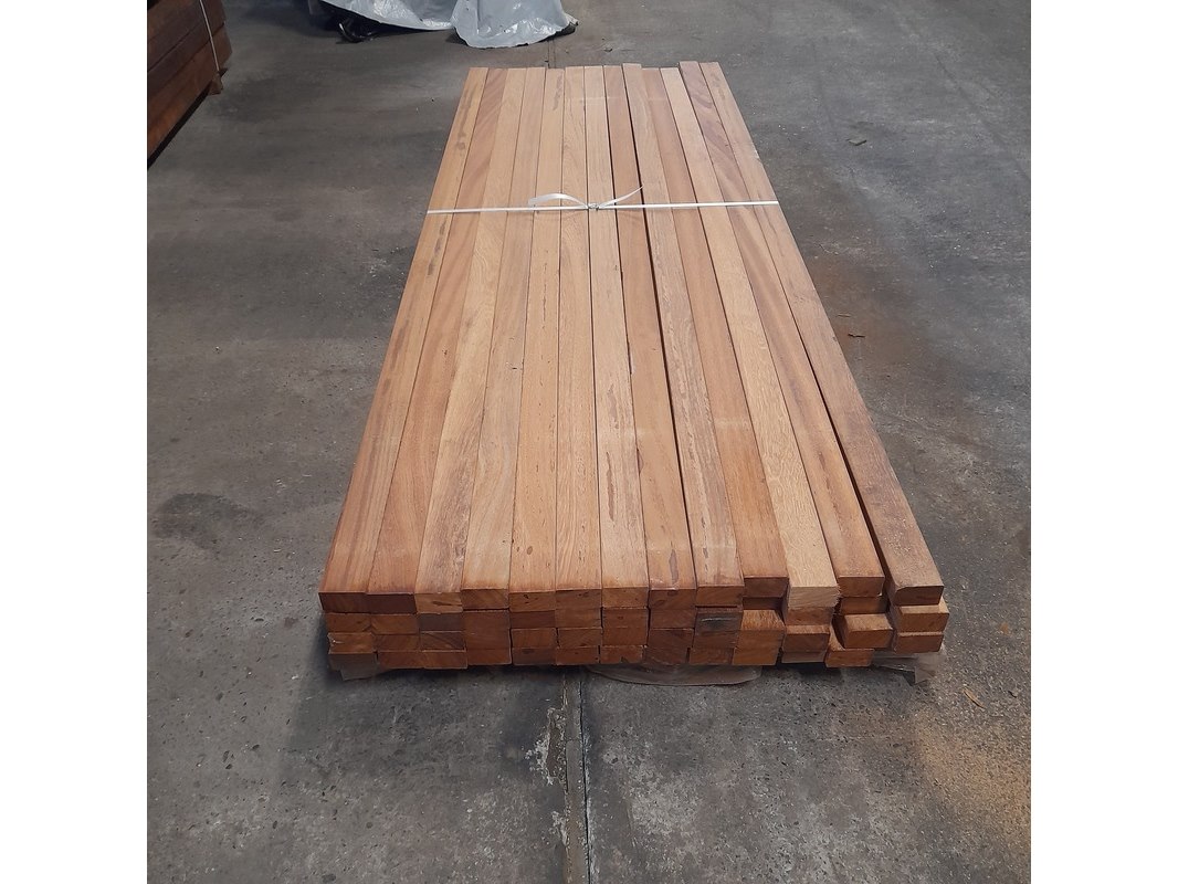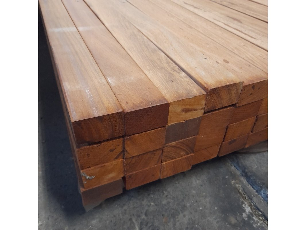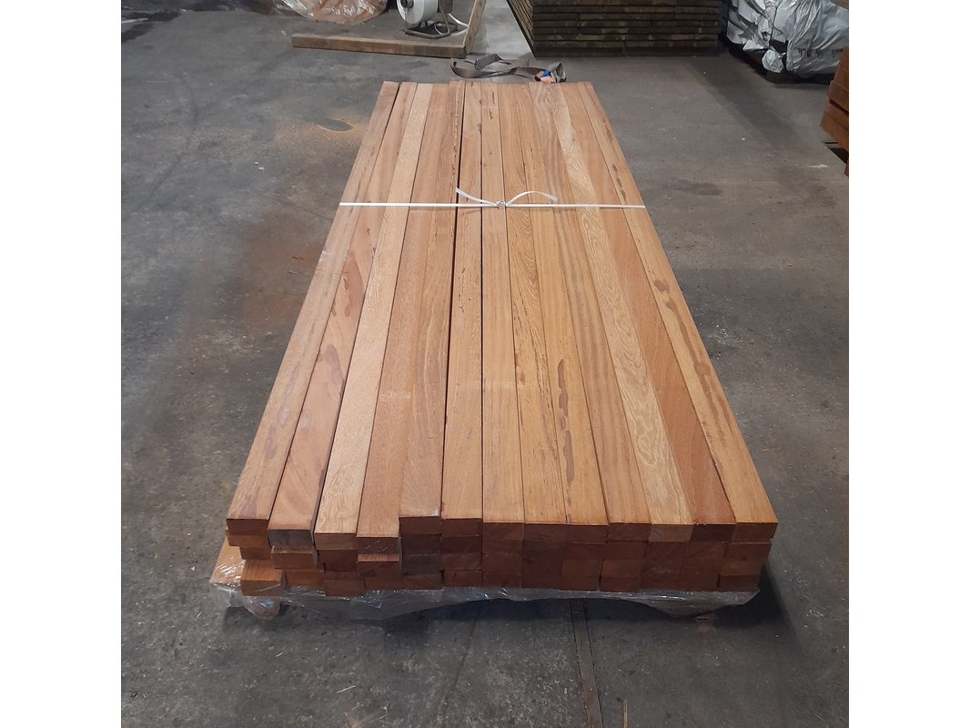 Product: Hardhouten regel Materiaal: Angelim Pedra Afmeting: 4,5 x 7 x 245 cm Conditie: nieuw