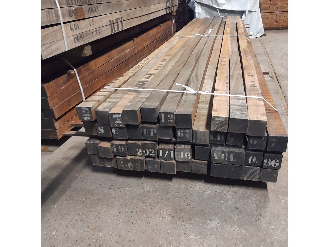Product: Hardhouten paal Materiaal: Okan Afmeting: 7 x 7 x 400 cm Conditie: nieuw