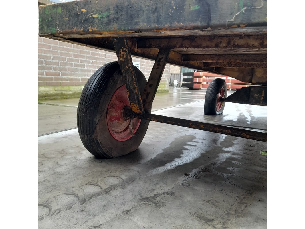 Product: Trekkar / plateauwagen Materiaal: Metaal Afmeting: 100 x 200 cm Conditie: gebruikt Specificaties: Afmeting plateau 100 x 200 cm (bxl) Lengte dissel ca. 165 cm Banden/velgen beschadigd