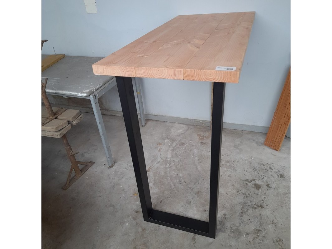 Product: Bartafel met metalen tafelpoten Materiaal: Douglashout en metaal Afmeting: 130 x 60 x 110 cm hoog Conditie: nieuw Specificaties: Met stalen U-poot, kokermaat 4x8 cm, zwart gepoedercoat Inclusief hoeklijn voor montage aan de muur Dikte blad ca. 4,5 cm