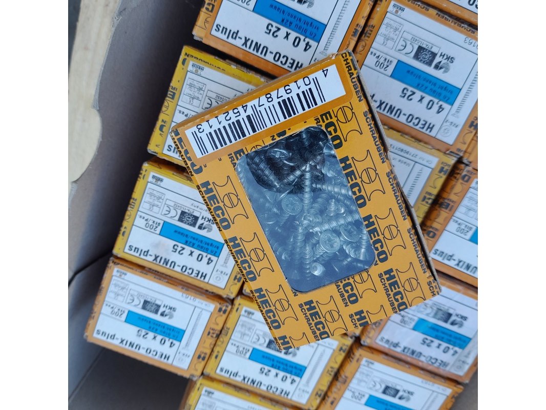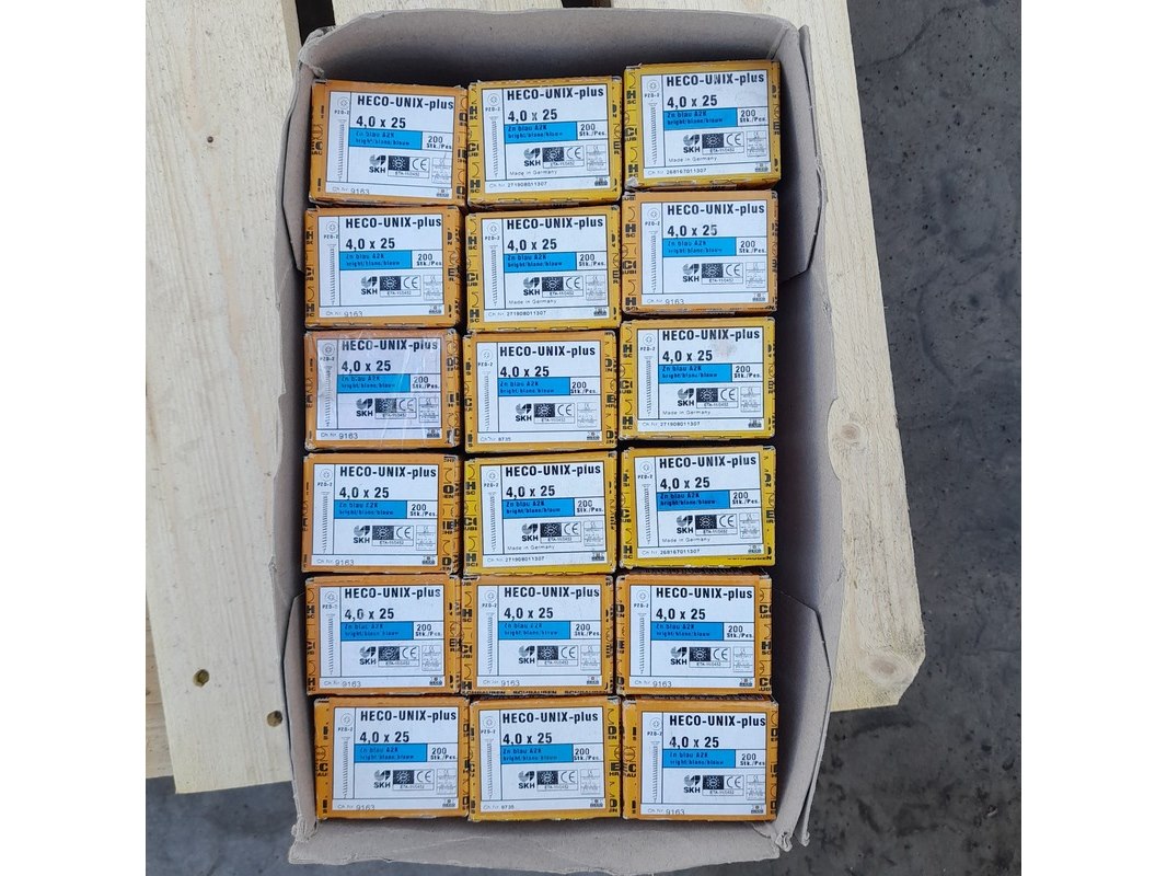 Merk: Heco Product: Doos universeel schroeven Materiaal: Metaal, verzinkt Afmeting: 4.0 x 25 mm Conditie: nieuw Specificaties: Verzinkte universeel schroeven 4.0 x 25 mm, voldraad PZD-2 aandrijving Totaal 18 dozen van 200 stuks (3600 schroeven totaal)