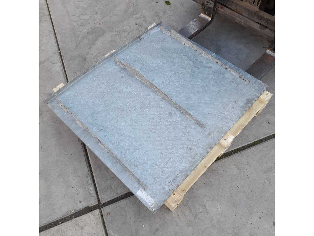 Product: Oprijplaat Materiaal: Metaal, verzinkt Afmeting: 85 x 96,5 cm Conditie: gebruikt Specificaties: Afmetingen 96,5 cm breed; 85 cm lang en ca. 9 cm hoog