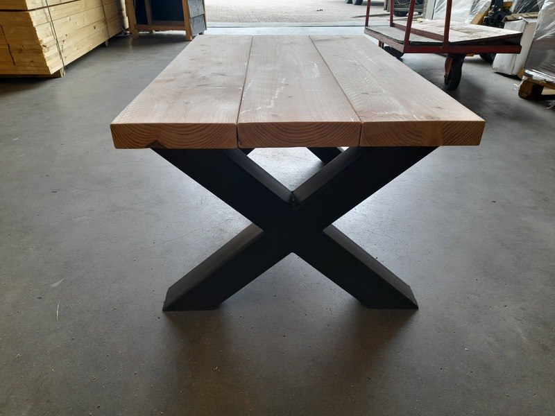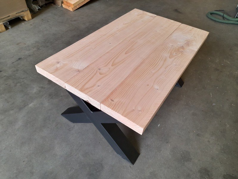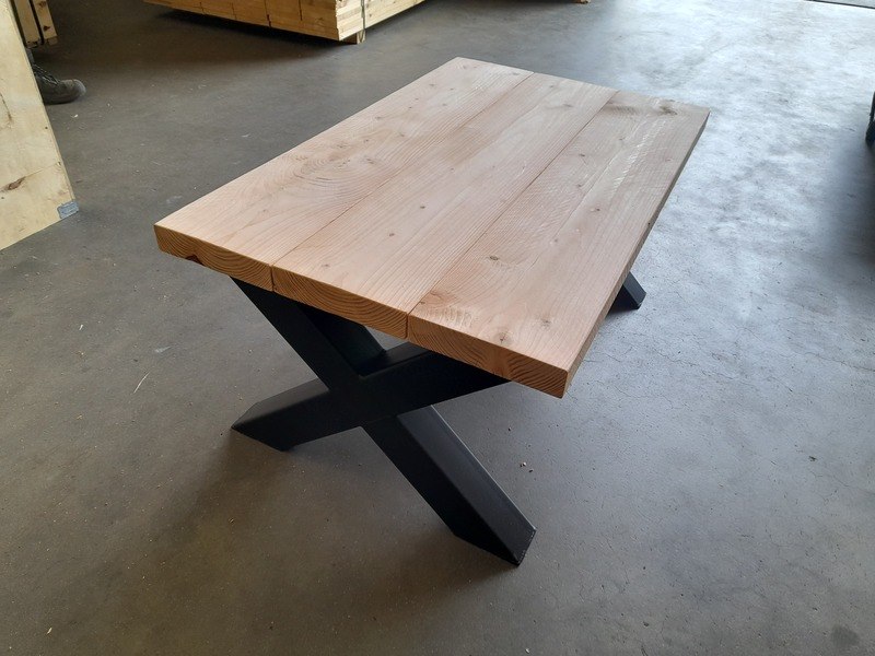 Product: Salontafel met stalen X-poten Materiaal: Douglashout en metaal Afmeting: 60 x 100 x 46,5 cm hoog Conditie: nieuw Specificaties: Douglas tafel met stalen X-poten, kokermaat 8x8 cm, zwart gepoedercoat Dikte blad ca. 4,5 cm