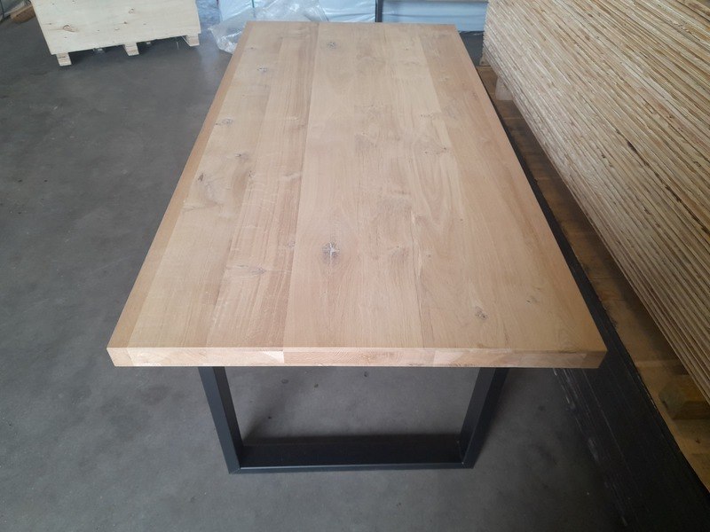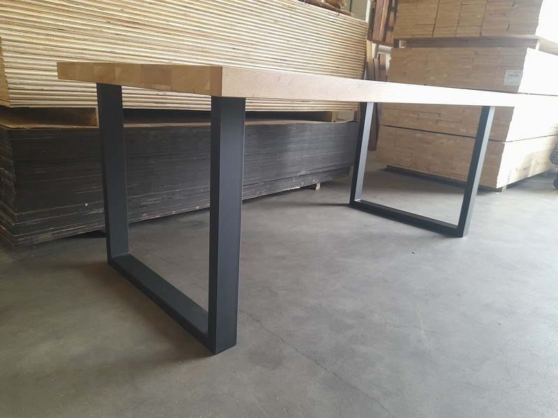 Product: Eettafel met stalen U-poten Materiaal: Hout en metaal Afmeting: 100 x 200 x 79 cm hoog Conditie: nieuw Specificaties: Eiken tafel met stalen U-poten, kokermaat 4x8 cm, zwart gepoedercoat Dikte blad ca. 6 cm