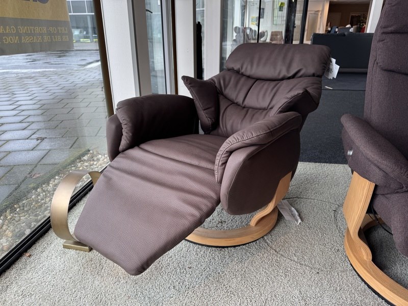 Product: Relaxfauteuil Kleur: Bruin Materiaal: Ecoleder Afmeting: M Specificaties: Showmodel, 1 colli Showmodellen kunnen gebruikssporen en/of beschadigingen hebben. Voor een goed beeld kun je gebruik maken van de kijkdag.