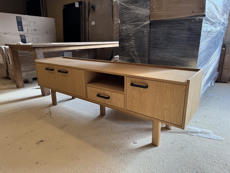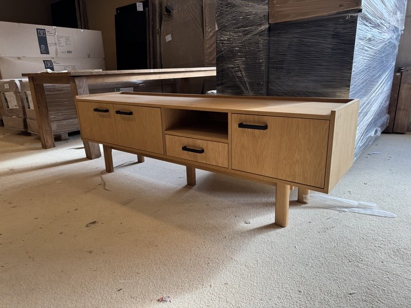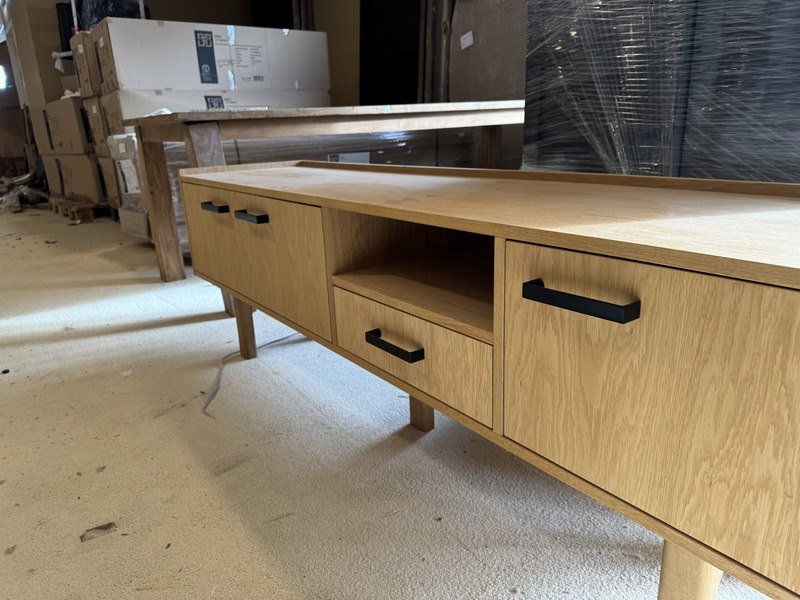 Product: TV- meubel Materiaal: Eiken Afmeting: 190x45x60(h) cm Specificaties: Showmodel