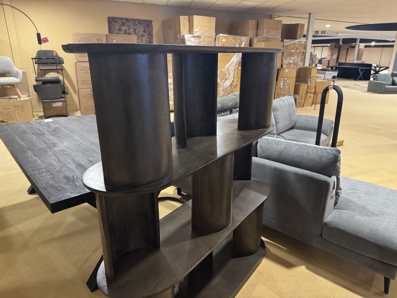 Product: Vakkenkast Kleur: Donkerbruin Materiaal: Mangohout Afmeting: 140x40x150 cm Specificaties: Showmodel, 1 colli