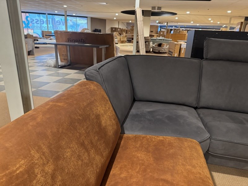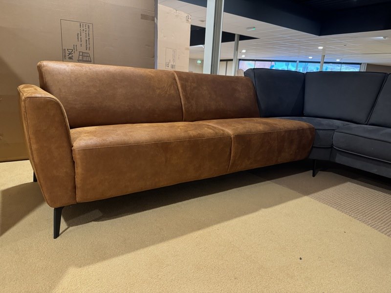 Product: Hoekbank Kleur: Cognac/antraciet Materiaal: Microvezelstof Afmeting: 200x280 cm Specificaties: Showmodel, 3 delen