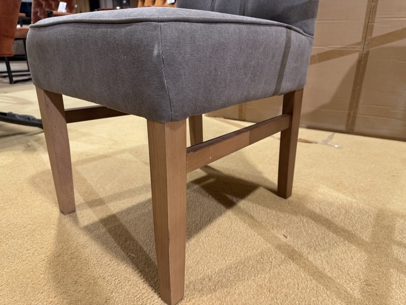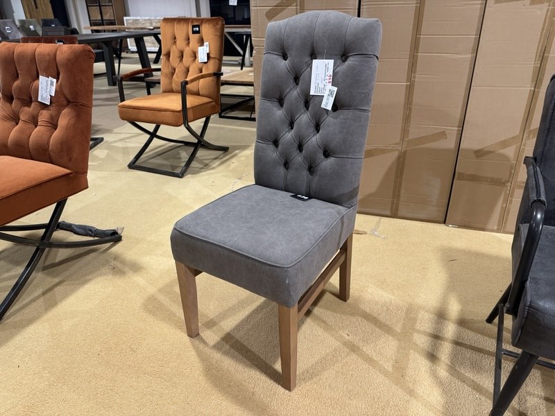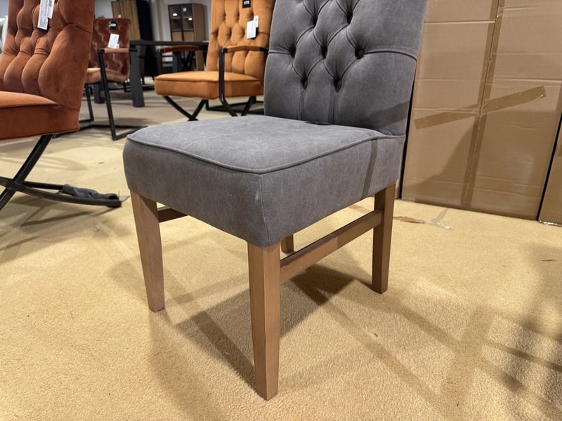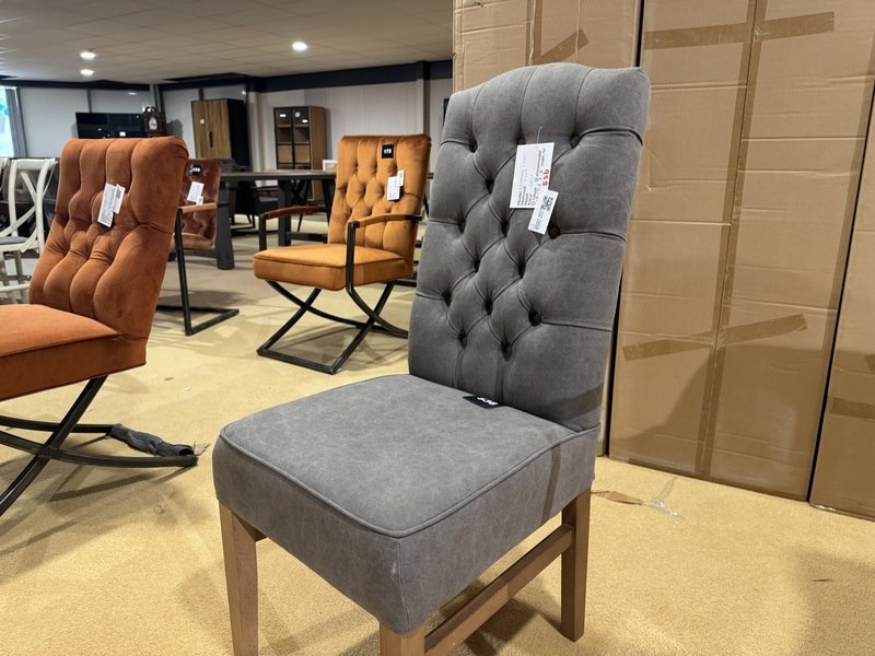 Product: Eetkamerstoel Kleur: Grijs Materiaal: Stof Specificaties: Showmodel, 1 colli
