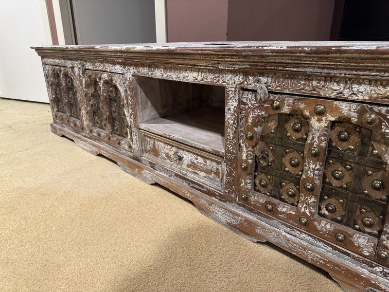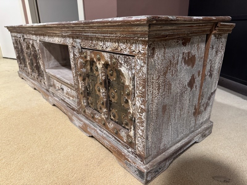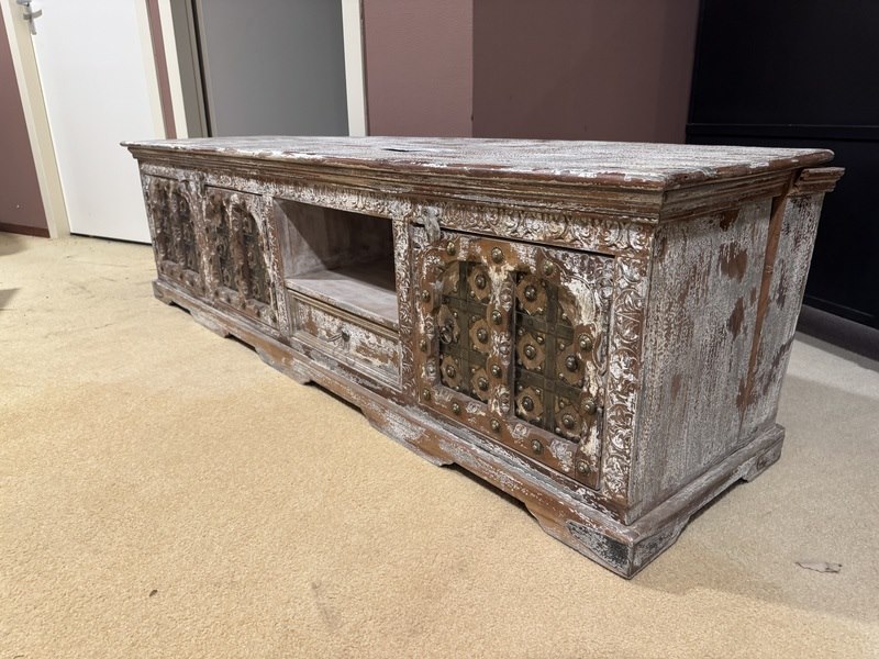 Product: TV- meubel Kleur: Bruin/beige gemêleerd Materiaal: Hout Afmeting: 180x45x50(h) cm Specificaties: Showmodel, B-keus