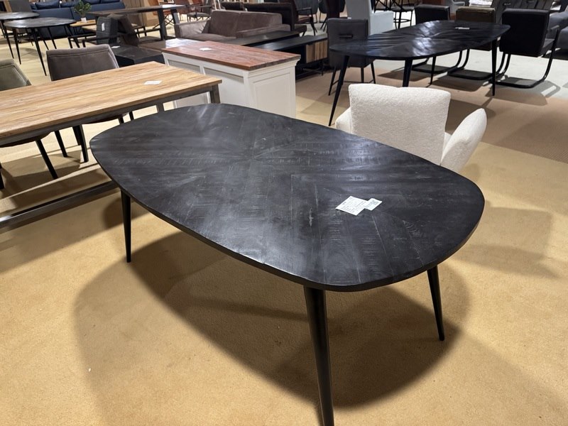 Product: Eettafel Kleur: Zwart Materiaal: Hout Afmeting: 180x100 cm Specificaties: Showmodel, B-keus