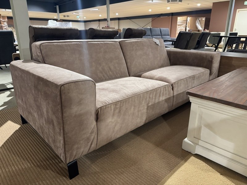 Product: 3-zits bank Kleur: Zand-beige Materiaal: Veloursstof Afmeting: 210x90x70(h) cm Specificaties: Showmodel, 1 colli