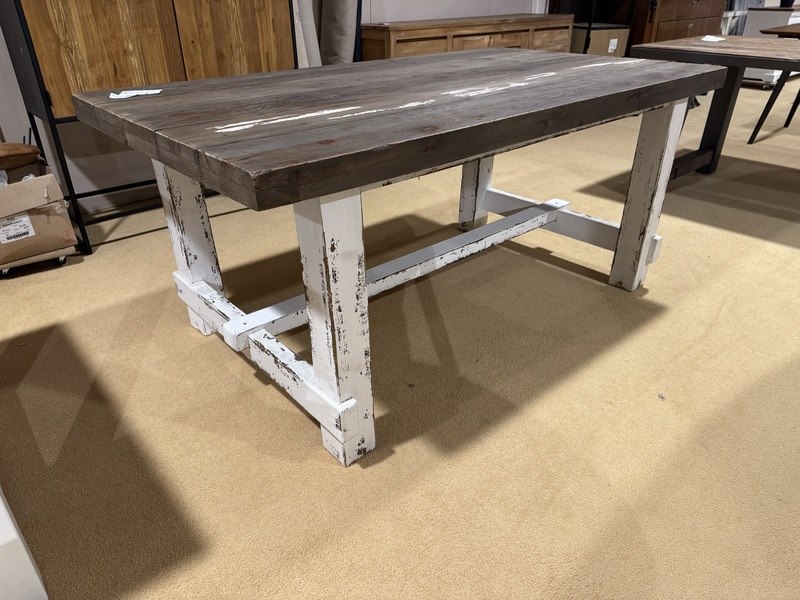 Product: Eettafel Kleur: Bruin + wit Materiaal: Hout Afmeting: 180x100 cm Specificaties: Showmodel, 1 colli