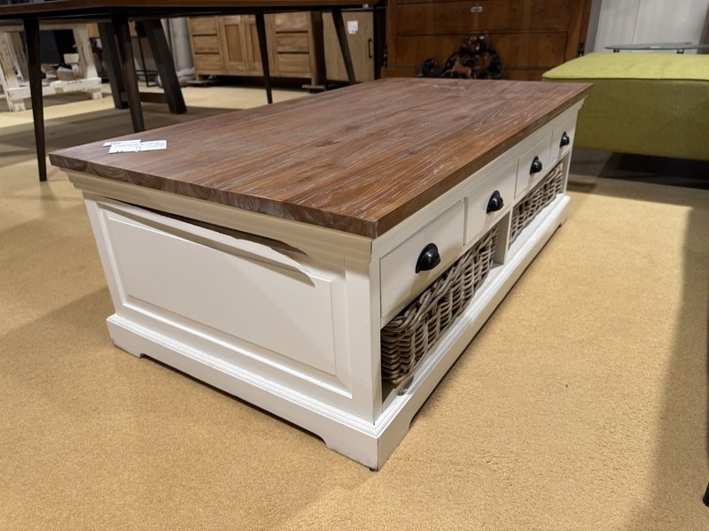 Product: Salontafel Kleur: Bruin + wit Materiaal: Hout Afmeting: 135x75 cm Specificaties: Showmodel, 1 colli