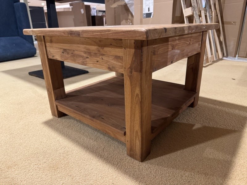 Product: Salontafel Kleur: Bruin Materiaal: Teak Afmeting: 70x70 cm Specificaties: Showmodel, B-keus, 1 colli
