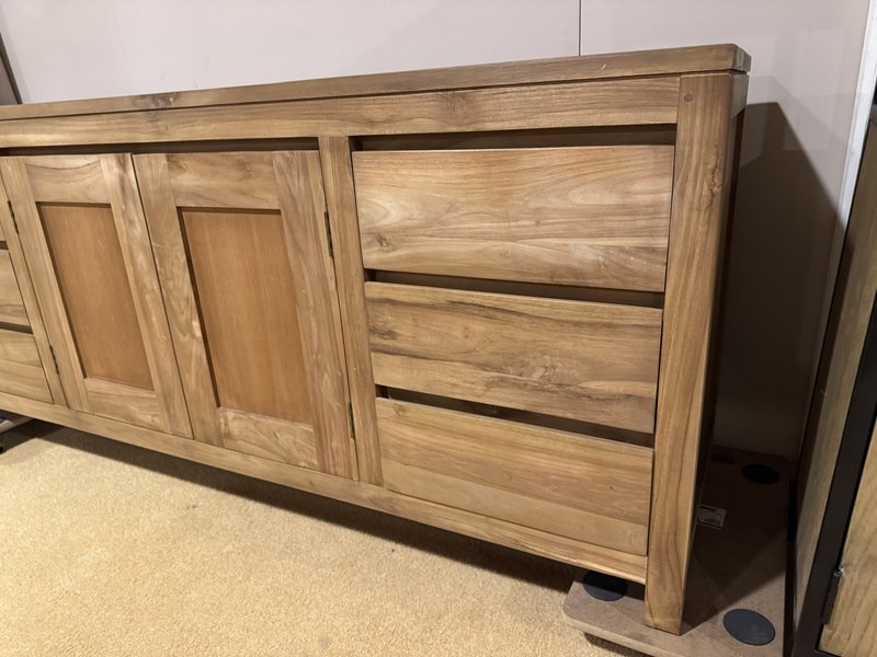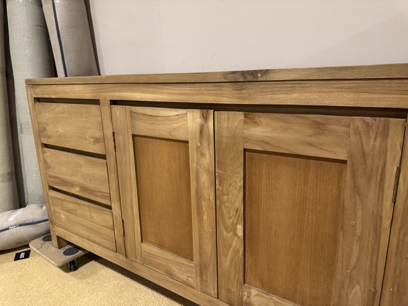 Product: Dressoir Kleur: Bruin Materiaal: Teakhout Afmeting: 180x45x75cm Specificaties: Showmodel, 1 colli