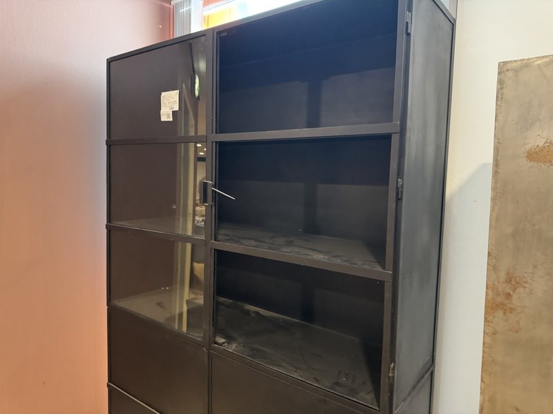 Product: Kast Kleur: Zwart Materiaal: Metaal Afmeting: 140x45x200 cm Specificaties: Showmodel, 1 colli