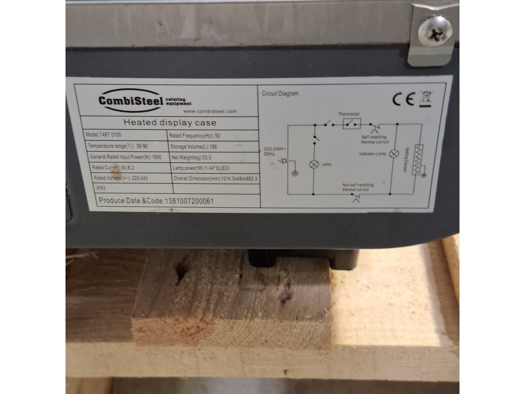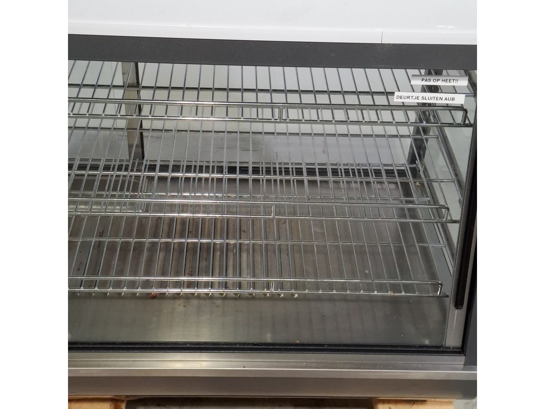 Merk: CombiSteel Product: Warmhoud vitrine Afmeting: HxBxD ca. 60x120x49 cm. Conditie: gebruikt Specificaties: 1800W 220-240V Gewicht ca. 53,5 kg Technische staat en compleetheid onbekend. Exclusief pallet