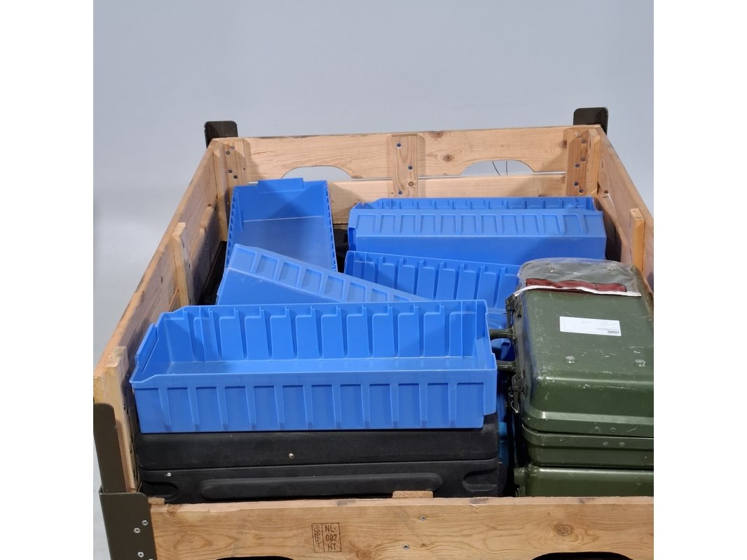 Product: Magazijnbakken en koffers Specificaties: Diverse soorten en maten. Technische staat en compleetheid onbekend. Exclusief pallet.