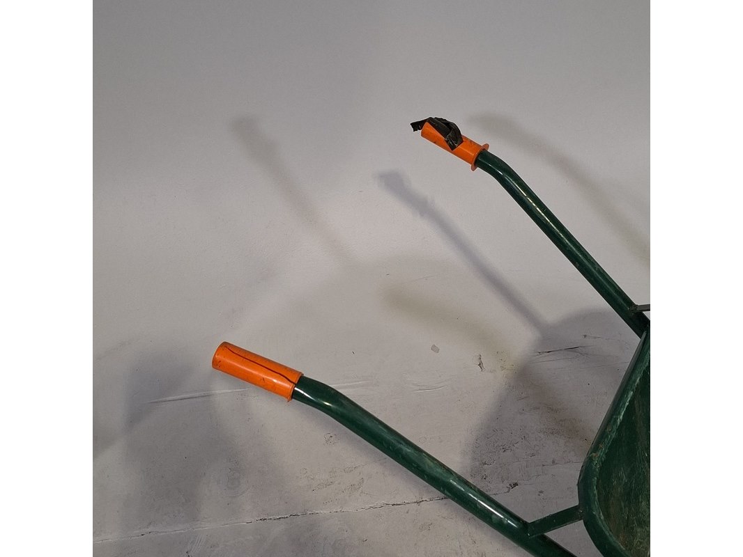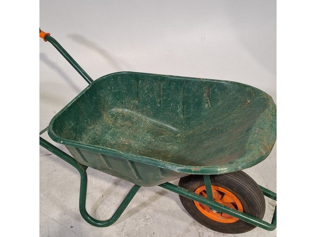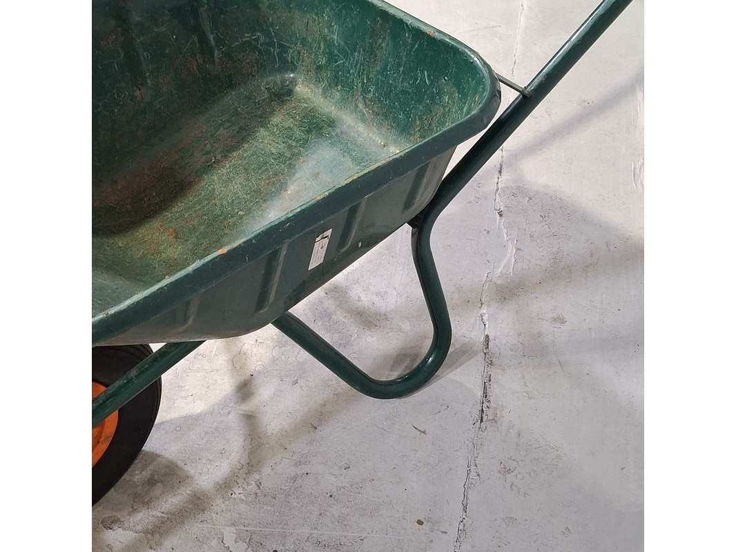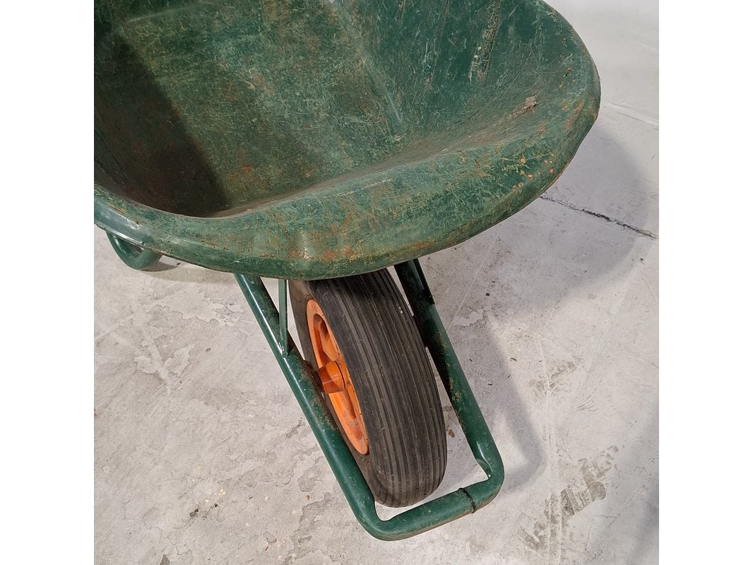 Product: Kruiwagen Afmeting: lxbxh ca. 133x59x63 cm Conditie: gebruikt Specificaties: Band is leeg.