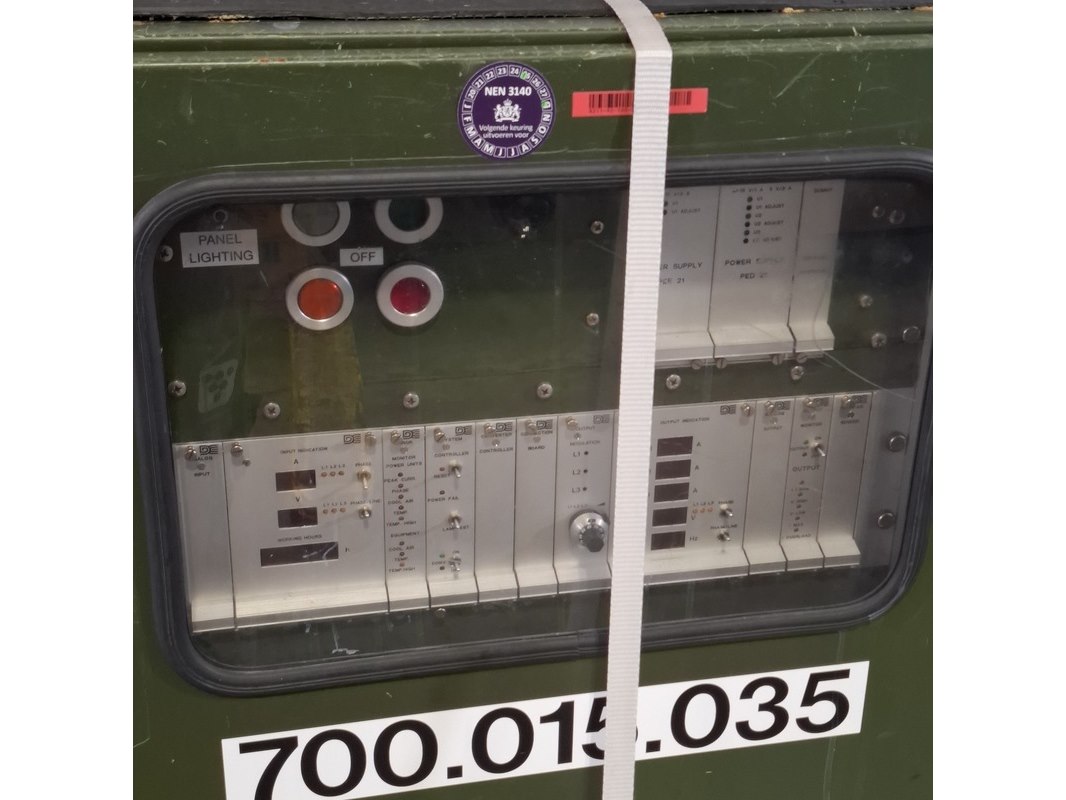 Merk: De Drie Electronics Product: Omvormer Afmeting: lxbxh ca. 123x61x115 cm Conditie: gebruikt Specificaties: Output 115/200 400Hz Technische staat en compleetheid onbekend. Exclusief pallet.