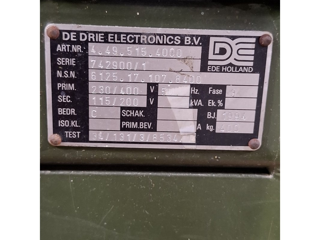 Merk: De Drie Electronics Product: Omvormer Afmeting: lxbxh ca. 123x61x115 cm Conditie: gebruikt Specificaties: Output 115/200 400Hz Technische staat en compleetheid onbekend. Exclusief pallet.