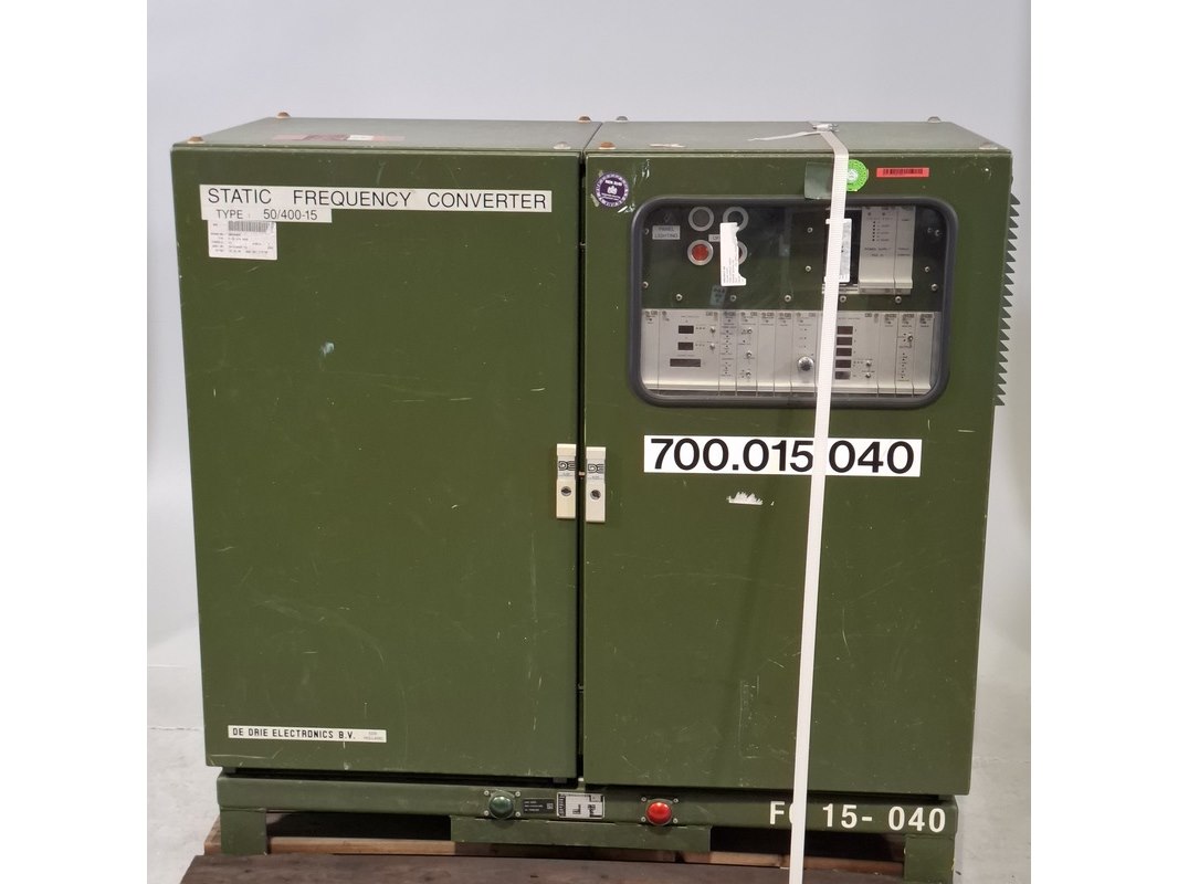 Merk: De Drie Electronics Product: Omvormer Afmeting: lxbxh ca. 123x61x115 cm Conditie: gebruikt Specificaties: Output 115/200 400Hz Technische staat en compleetheid onbekend. Exclusief pallet.