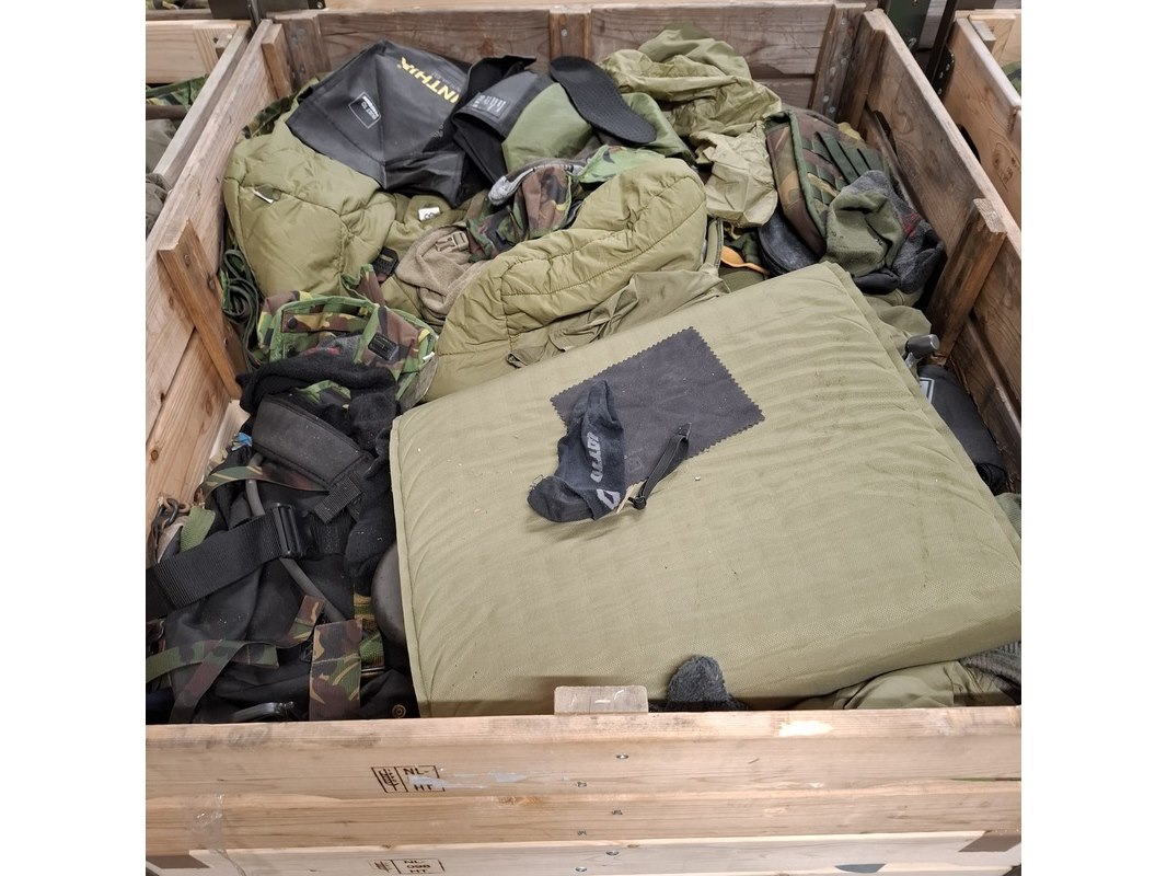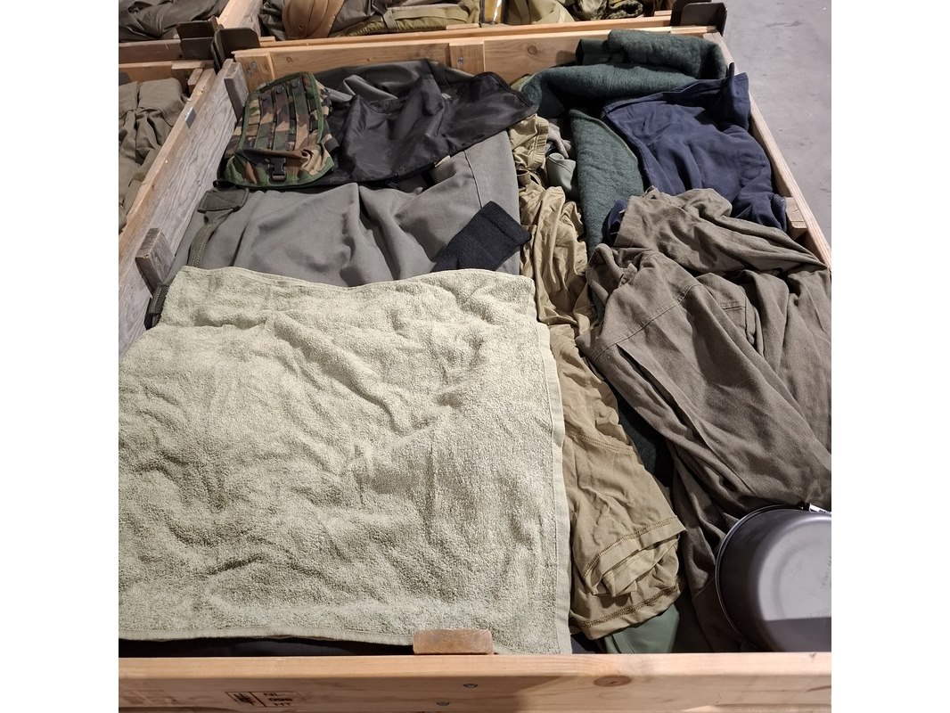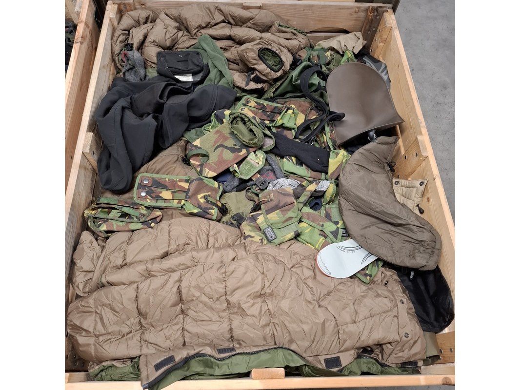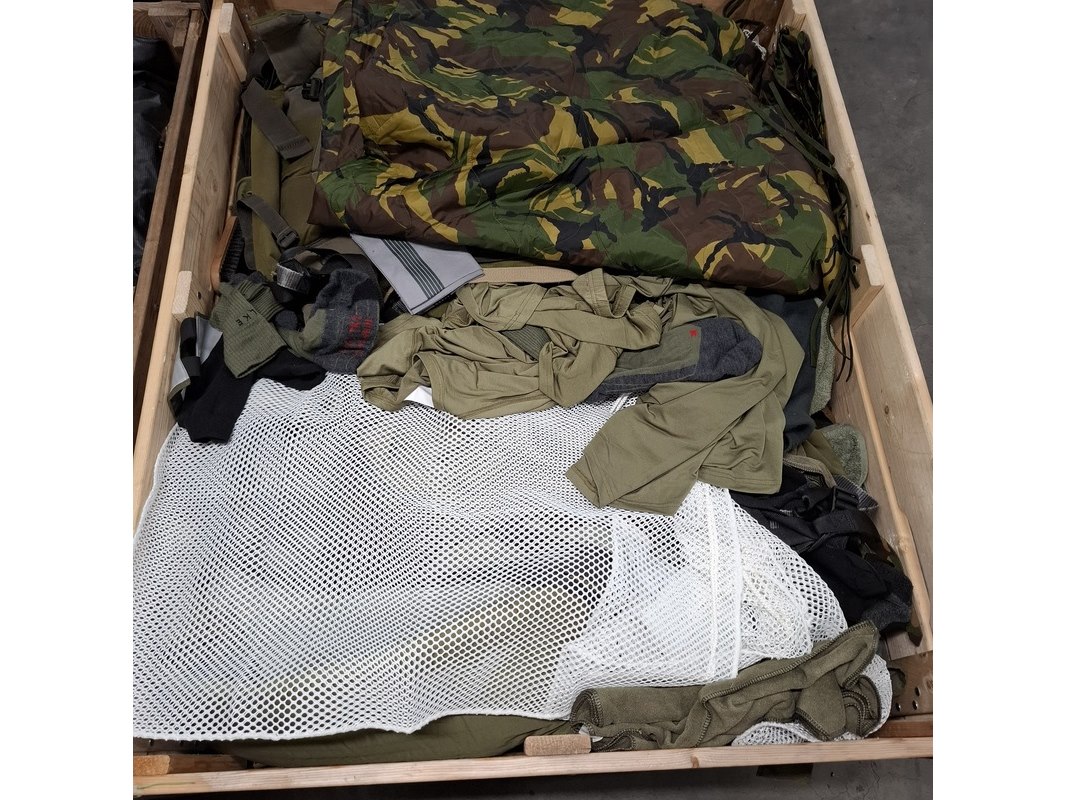Product: Persoonlijke uitrusting en kleding Defensie Conditie: gebruikt Specificaties: Bestaande uit ca. 34x palletbox ongesorteerde artikelen.