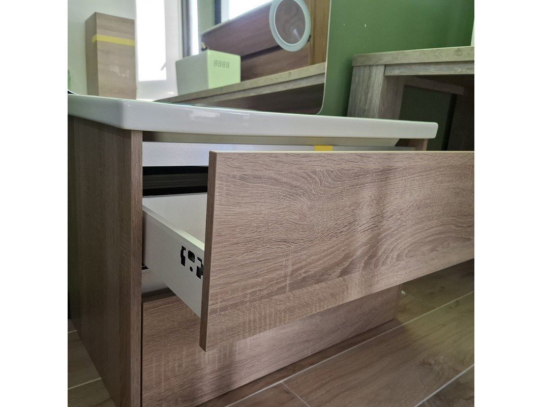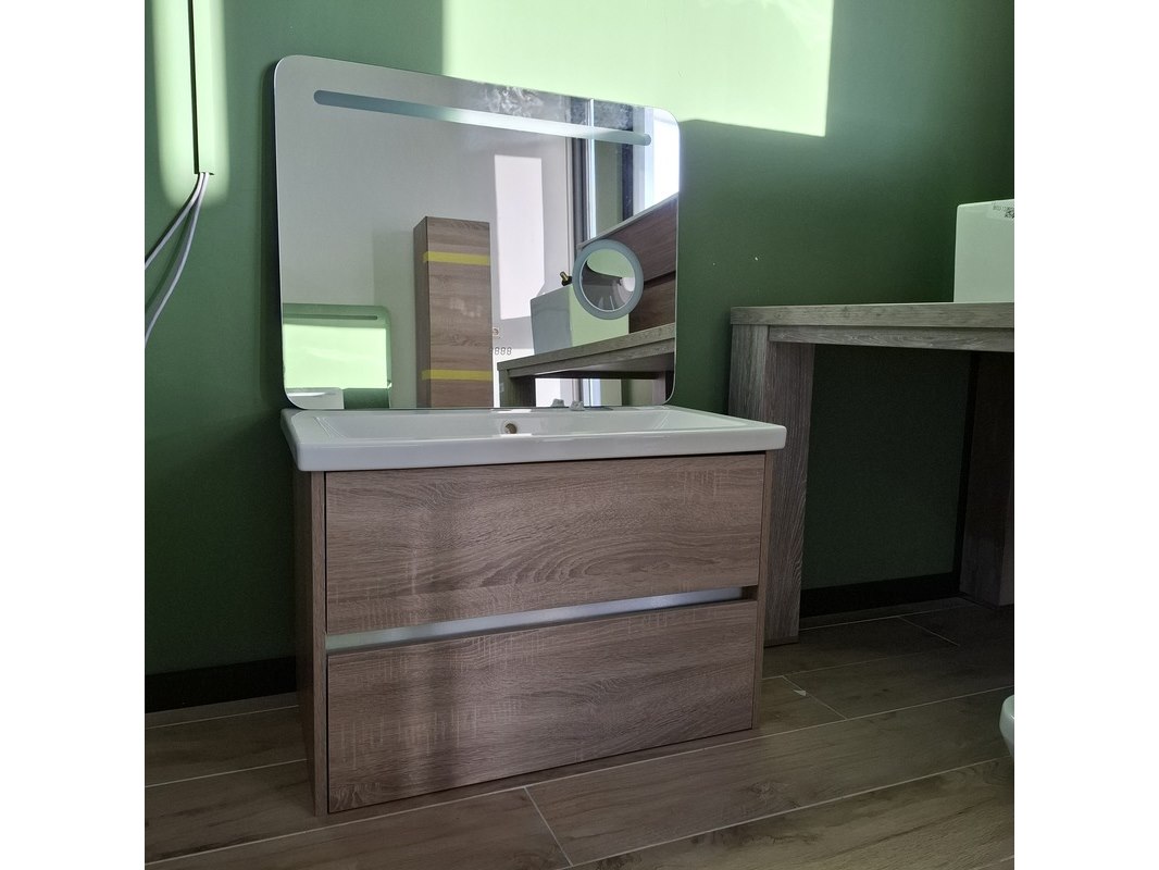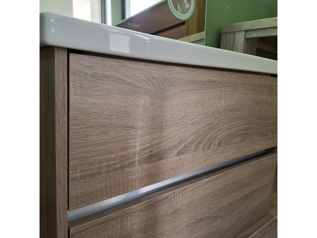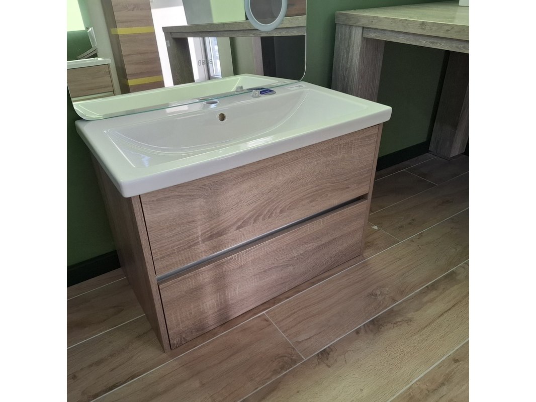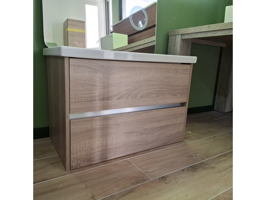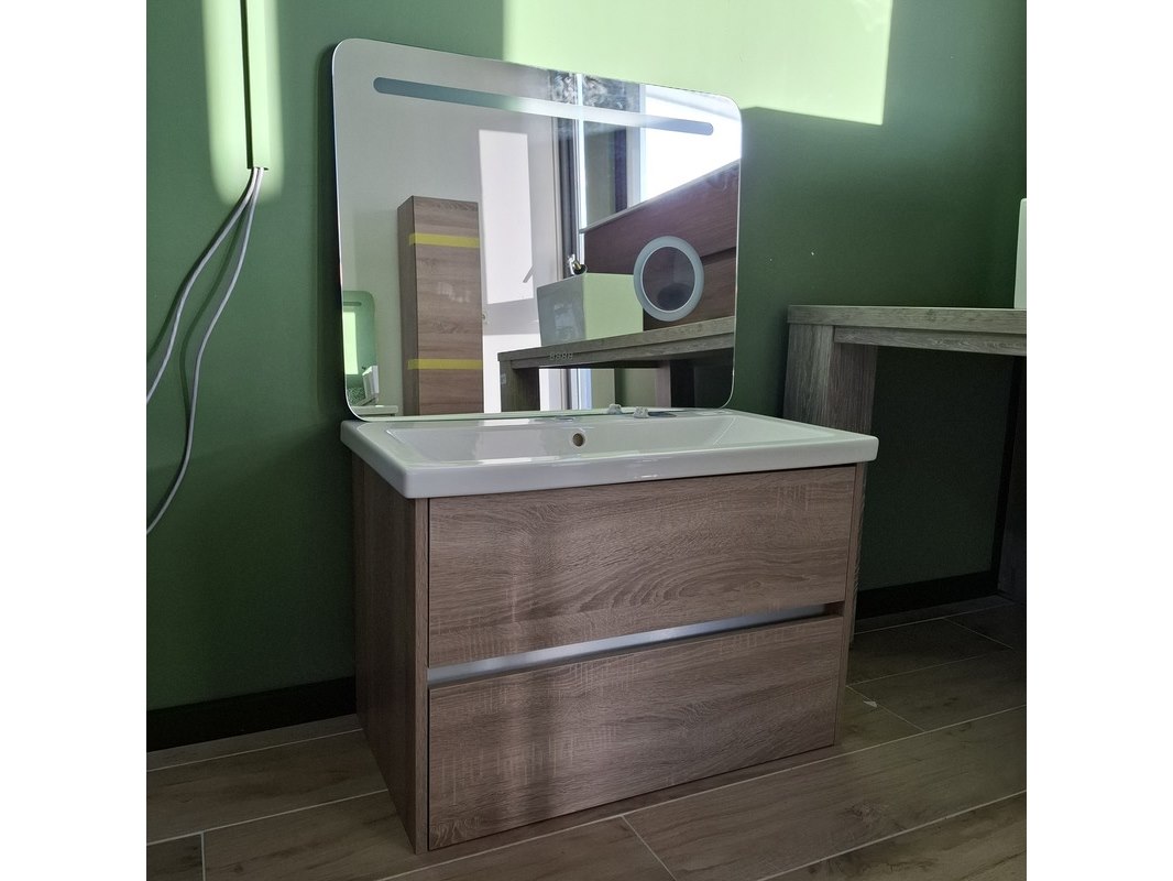 Merk: Sanox Product: Badmeubel Kleur: grijs eiken Afmeting: 80x46 Specificaties: 2 lades met softclose, greeploos, keramische wastafel, spiegel met Ledverlichting, met LED scheerspiegel, met tijdsaanduiding