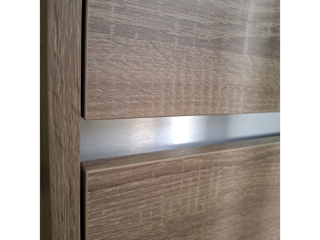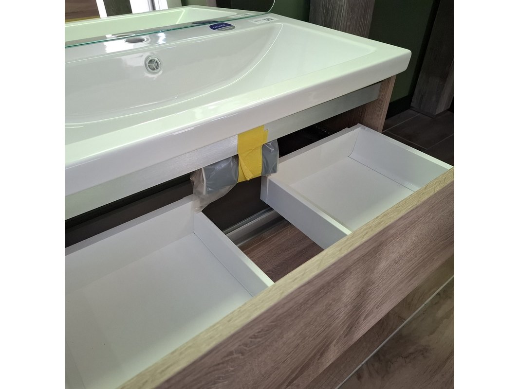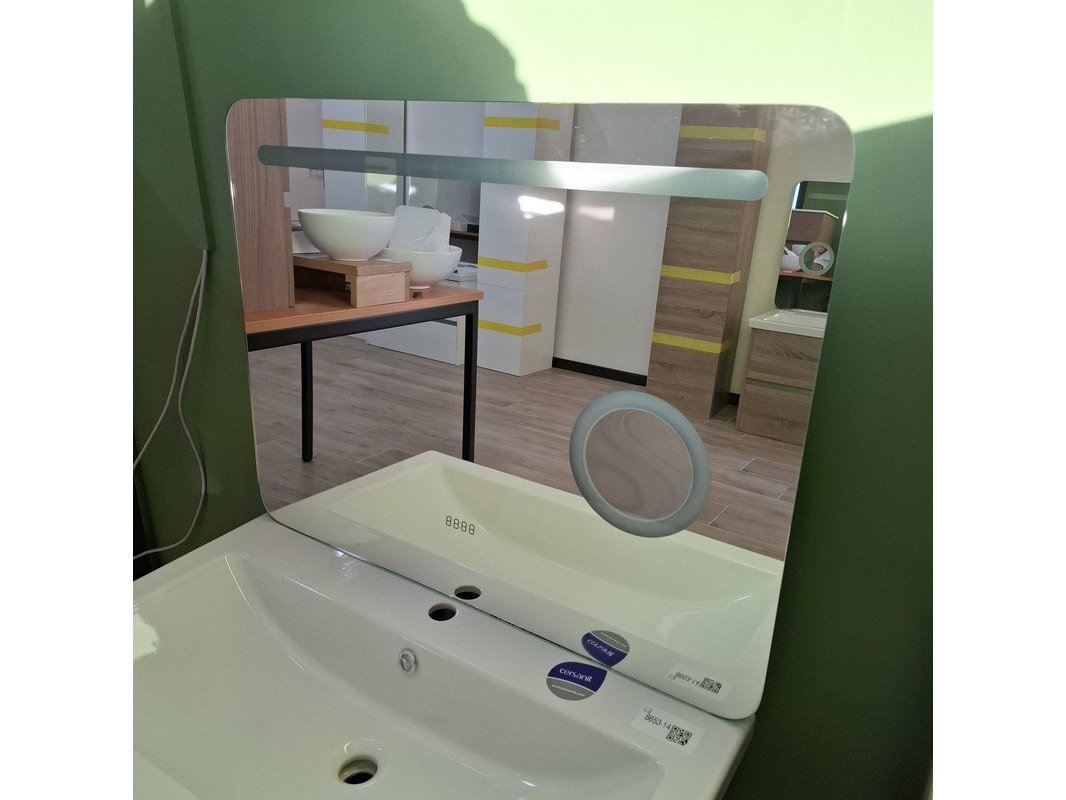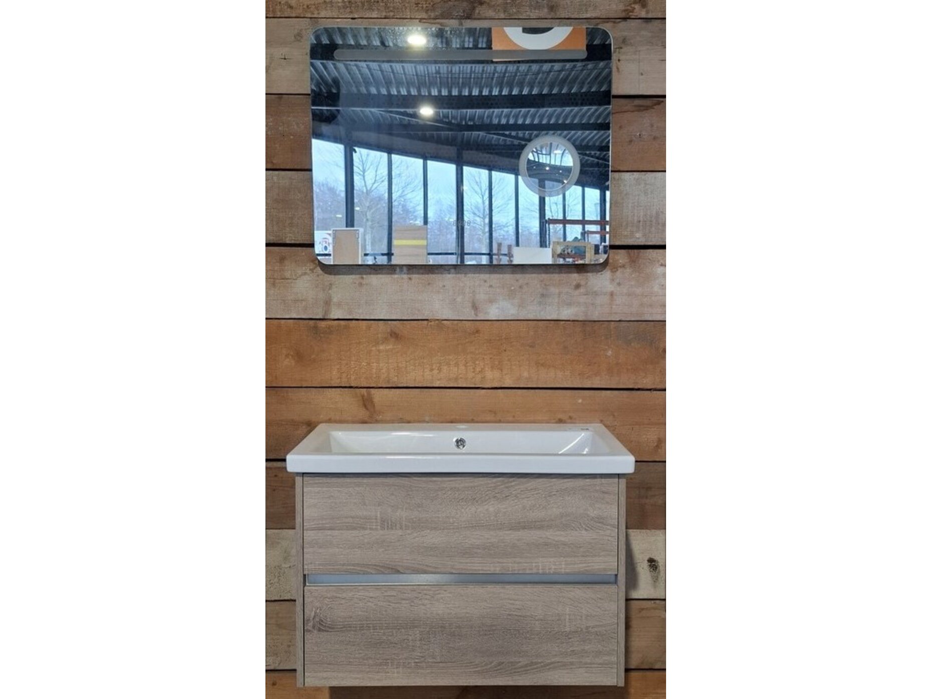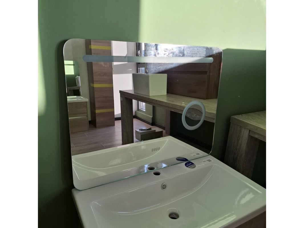 Merk: Sanox Product: Badmeubel Kleur: grijs eiken Afmeting: 80x46 Specificaties: 2 lades met softclose, greeploos, keramische wastafel, spiegel met Ledverlichting, met LED scheerspiegel, met tijdsaanduiding