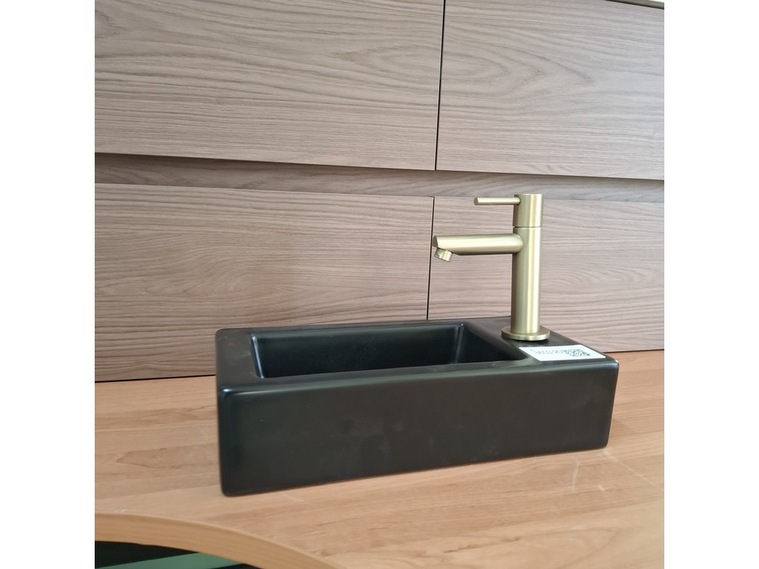 Product: Fonteinset Afmeting: 36x18cm Specificaties: set: fontein, keramiek, mat zwart, fonteinkraan, geborsteld goud, incl. click waste