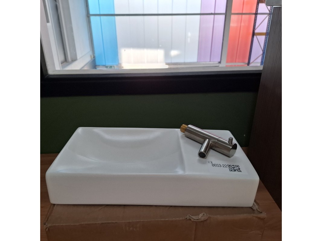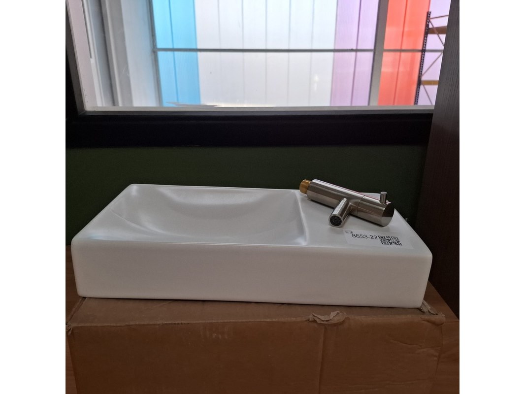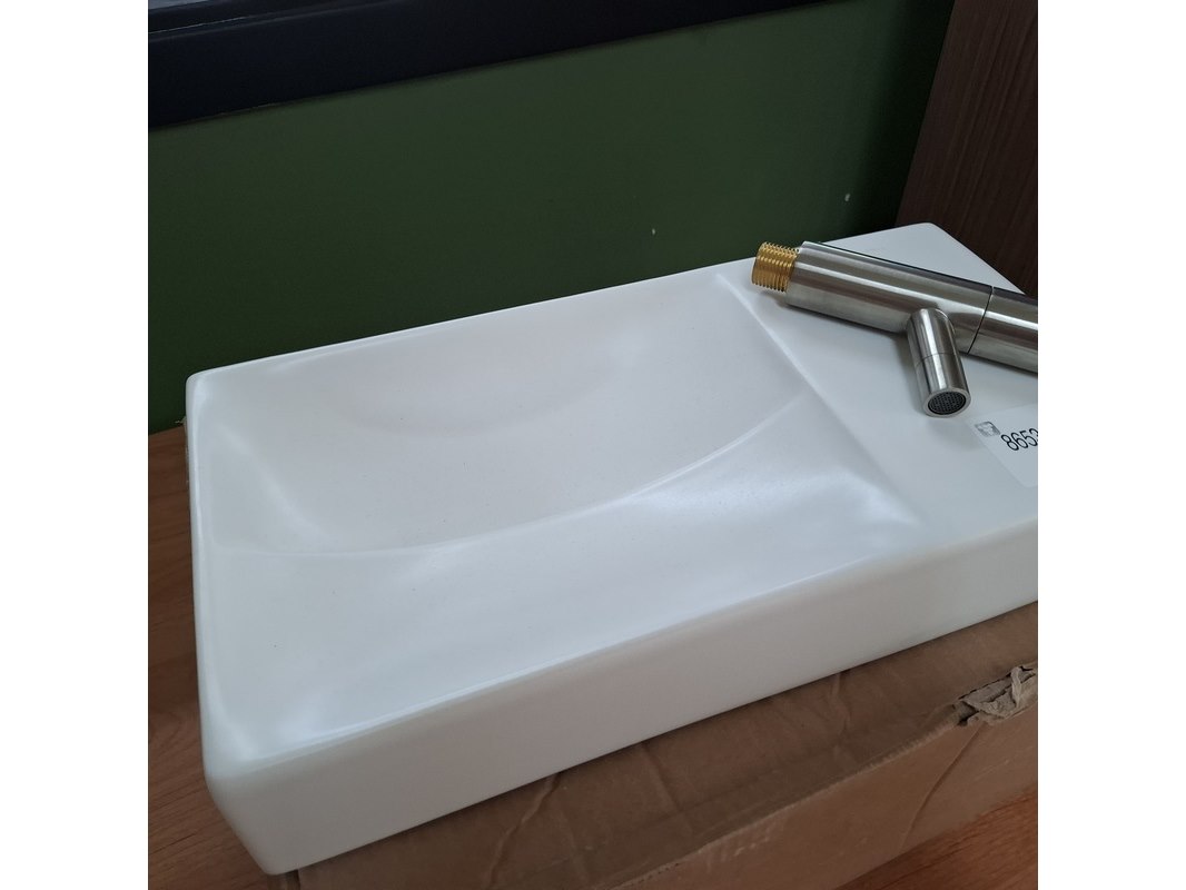 Merk: Clou Product: Fonteinset Specificaties: fontein, keramiek, mat wit, wand fonteinkraan, rvs geborsteld, art.nr. CL/03-021.61.RV