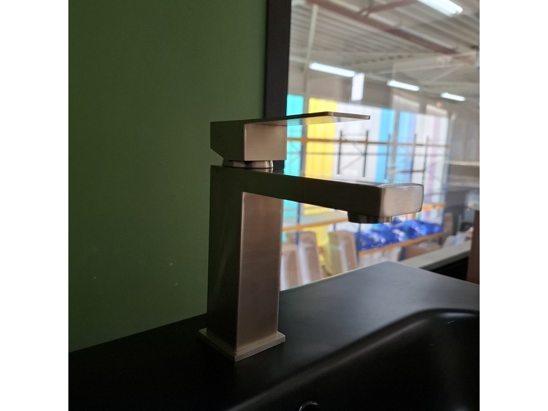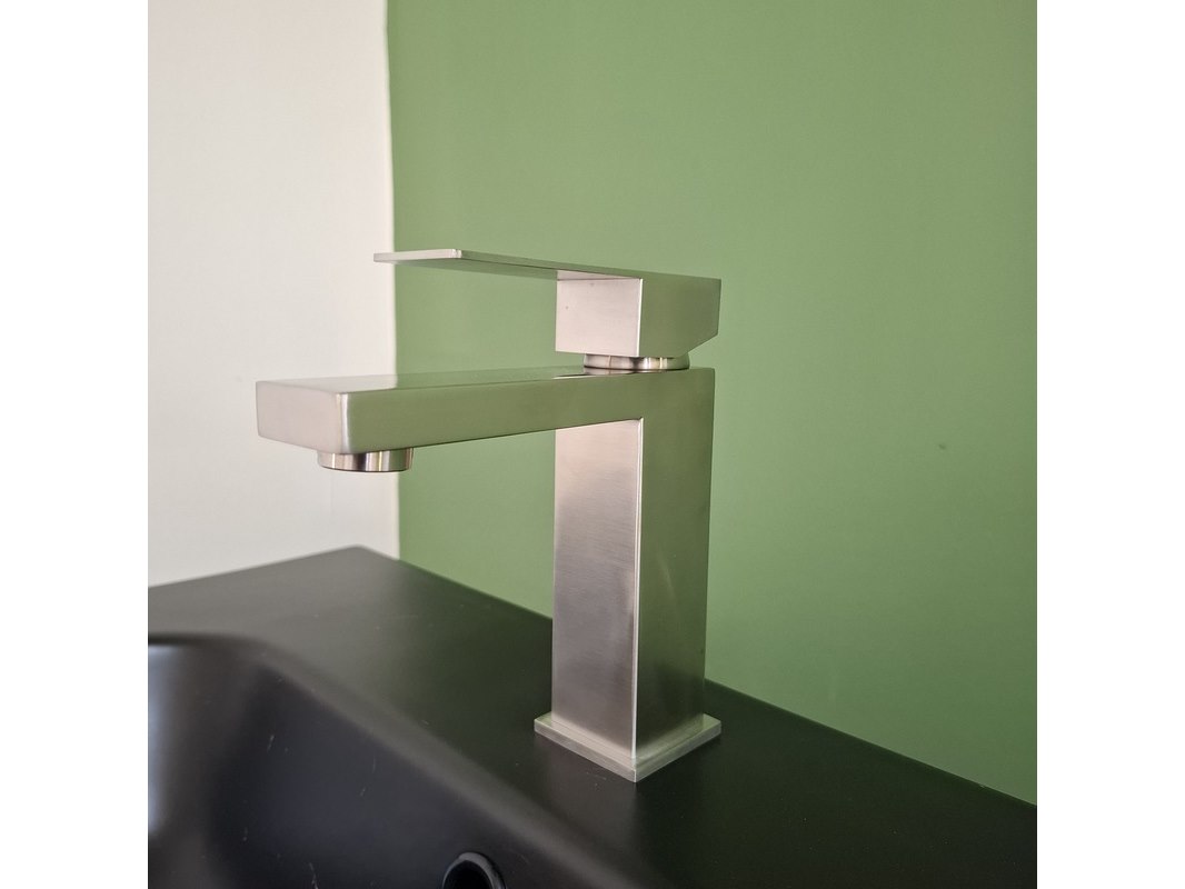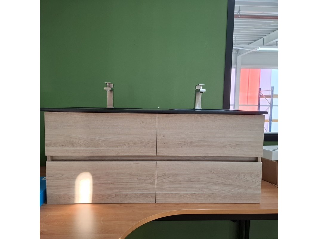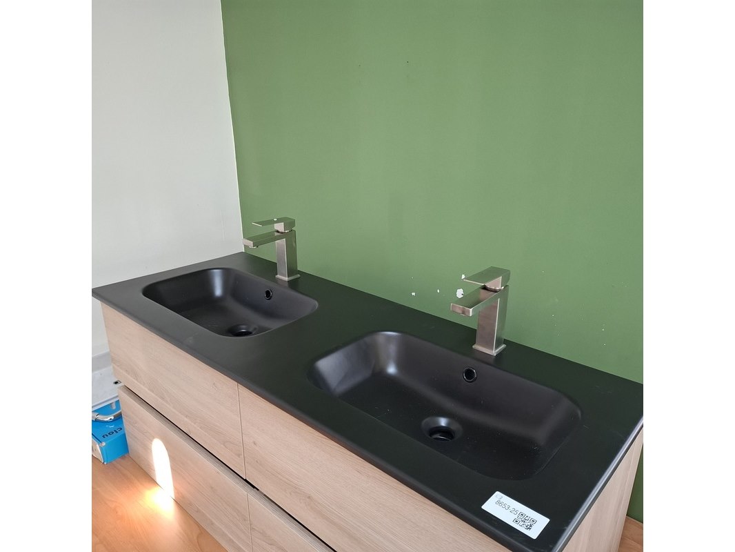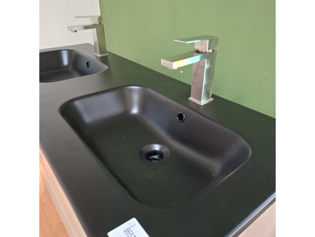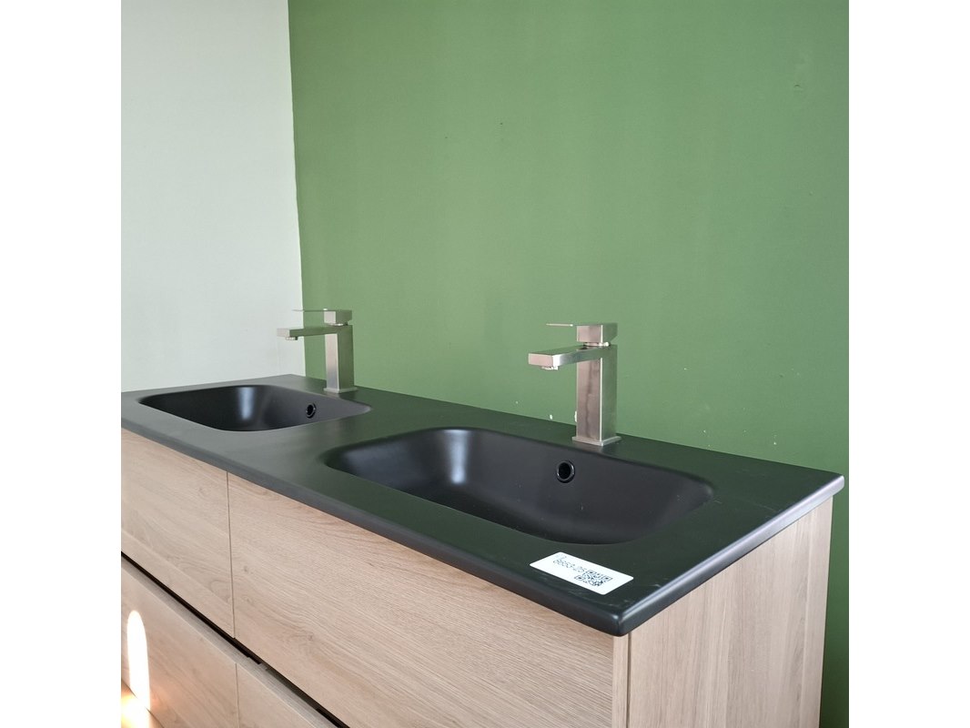 Merk: HR Badmeubelen Product: Badmeubel Afmeting: 120x46cm Specificaties: 4 lades met softclose, greeploos, keramische wastafel, mat zwart, 2 bakken, 2 kraangaten, 2x wastafelkraan, rvs geborsteld, 2x click waste, rvs geborsteld