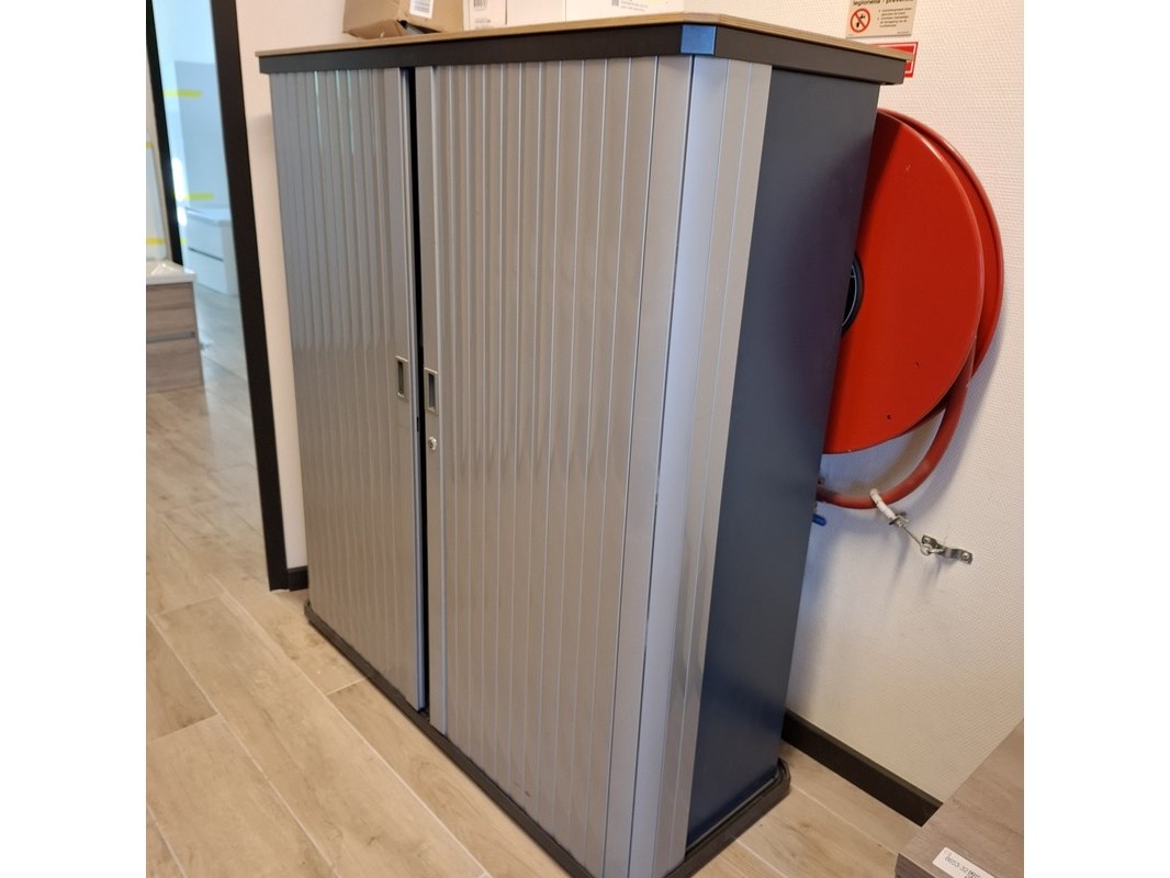 Merk: Gispen Product: Ladenkast Afmeting: 120x50x135cm Specificaties: kleur: aluminium met zwarte lades
