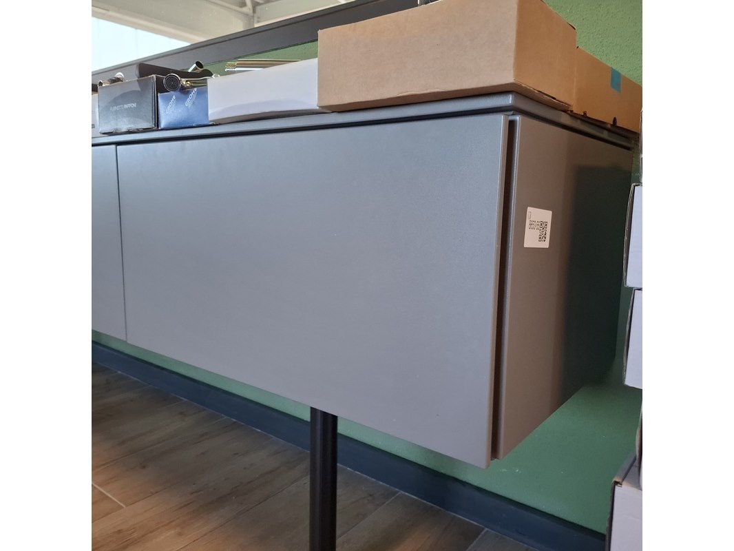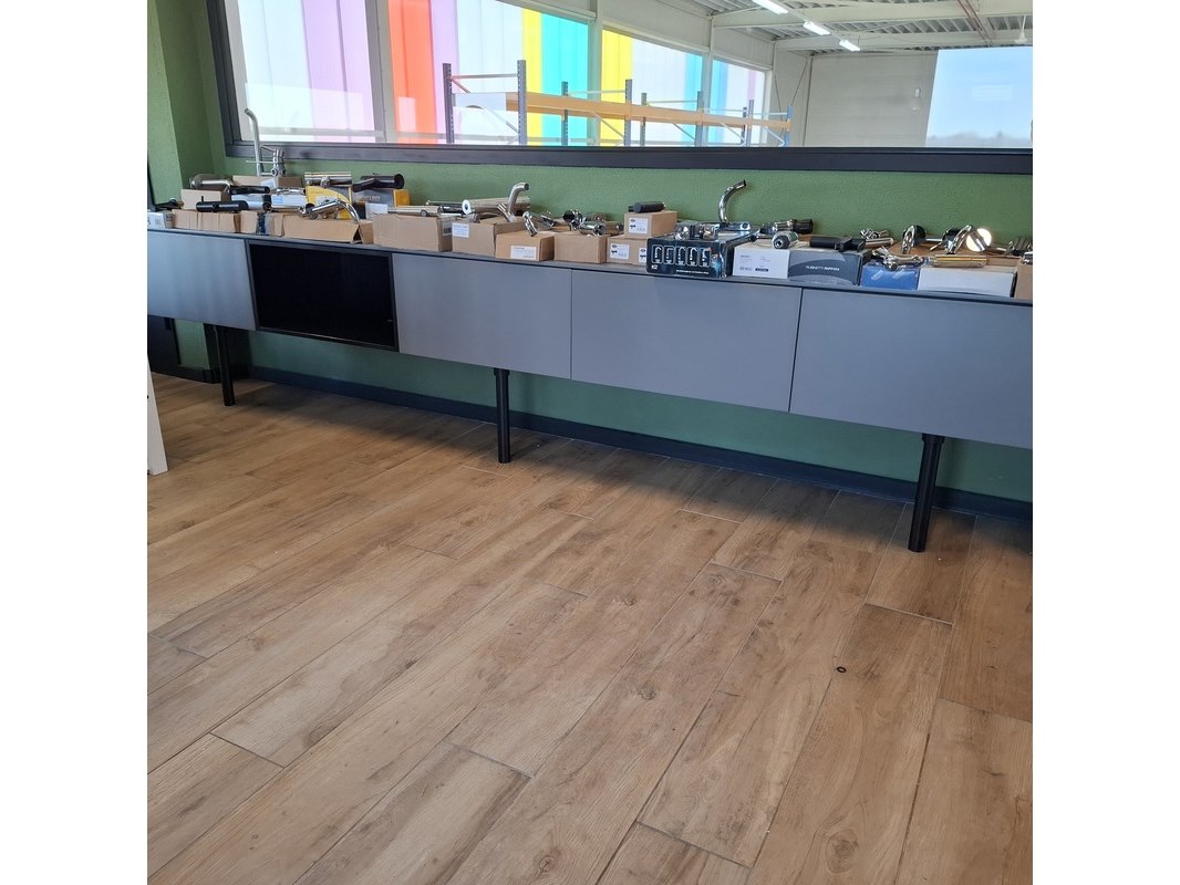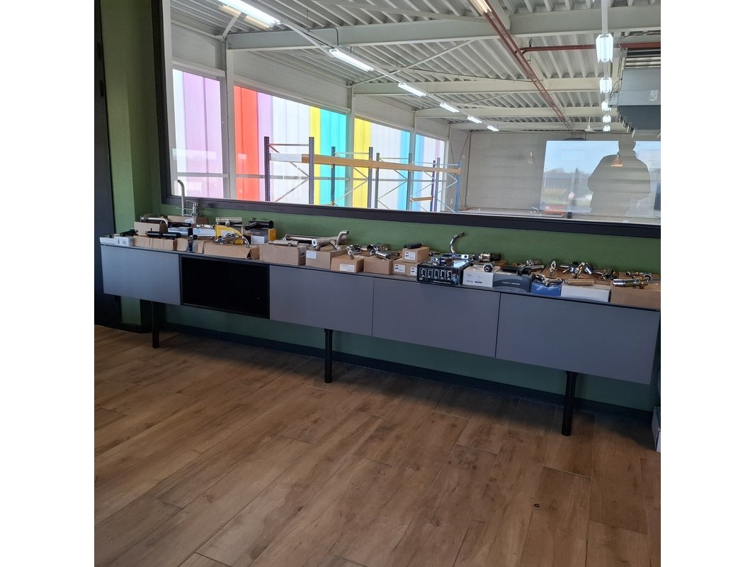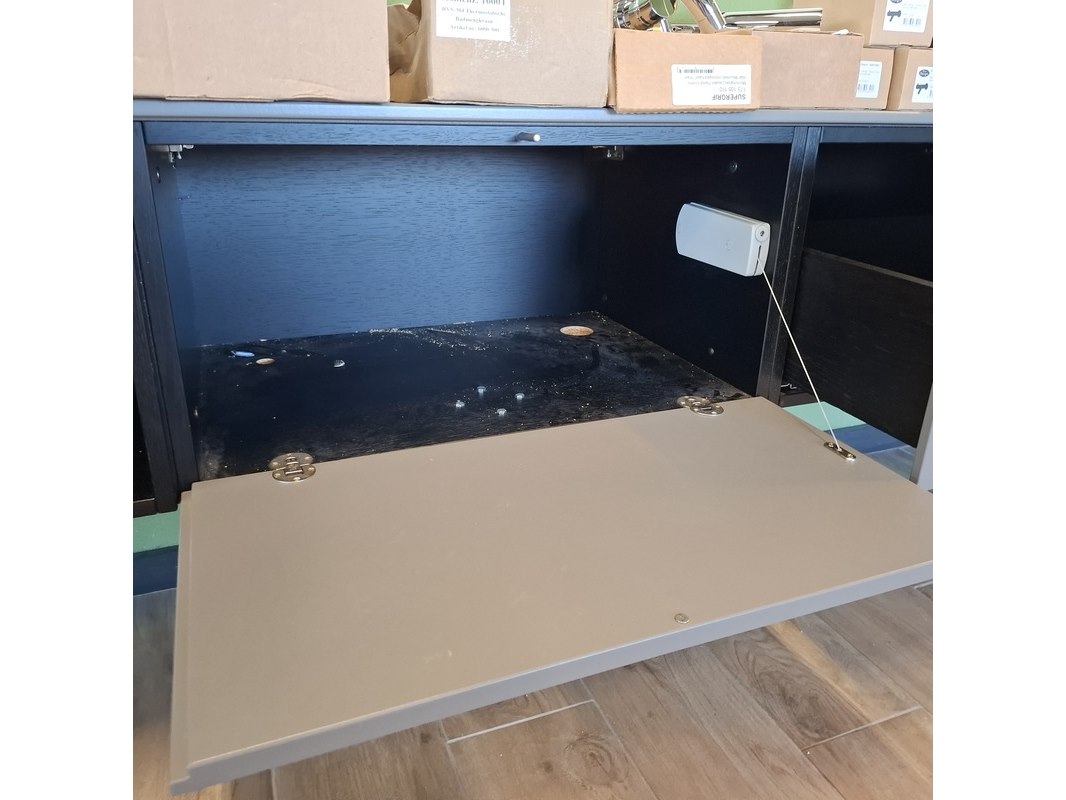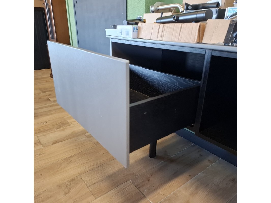 Product: TV-wandmeubel Kleur: taupe Afmeting: ca.335x48x33cm Specificaties: 4x push open lade, 1x open regaal