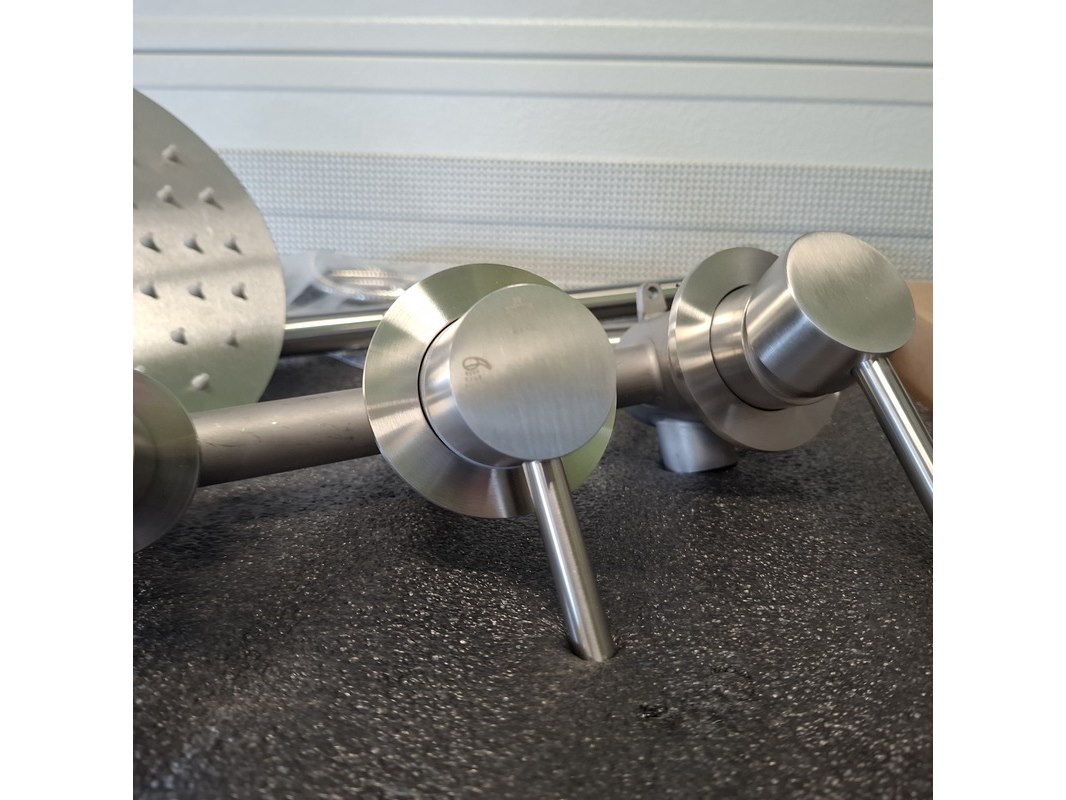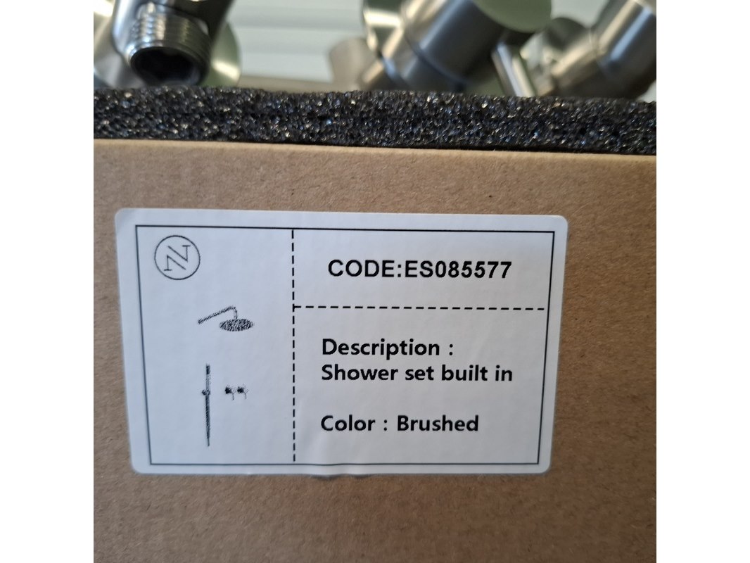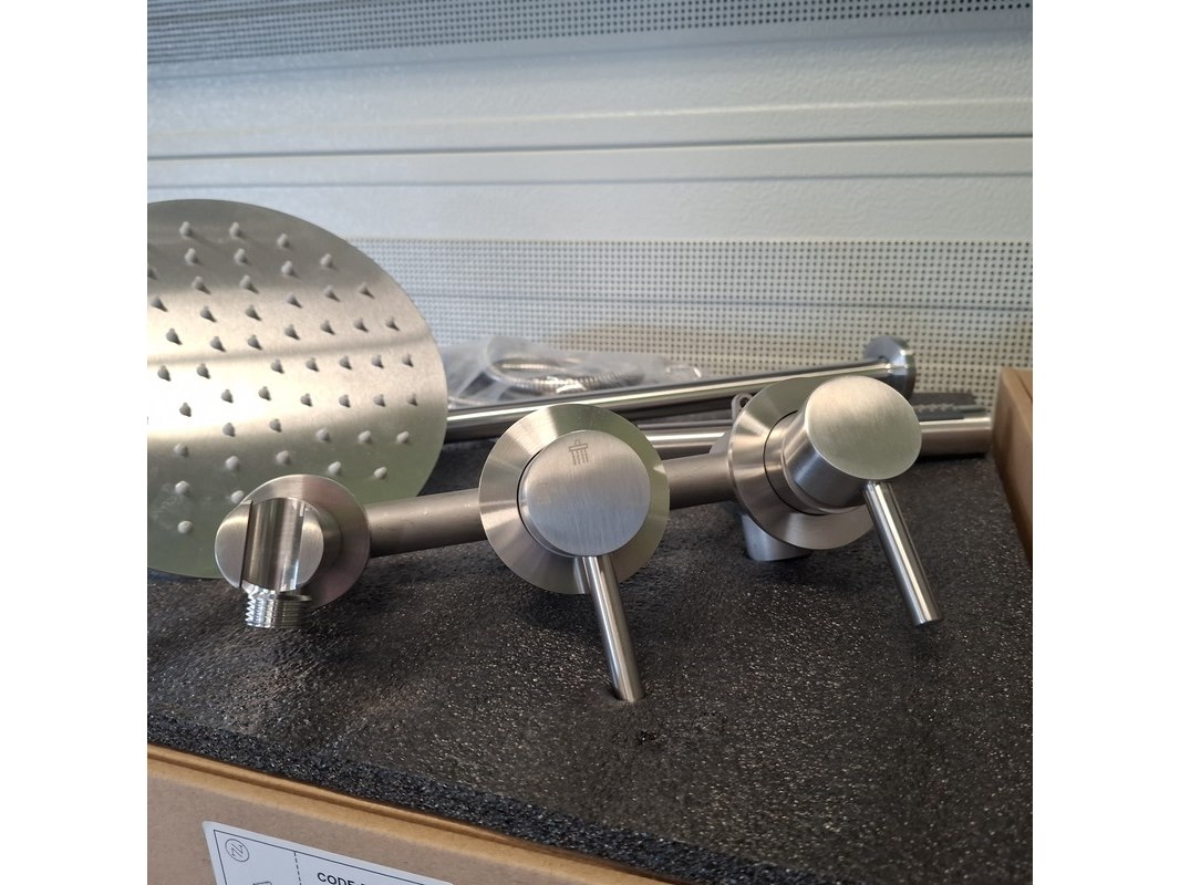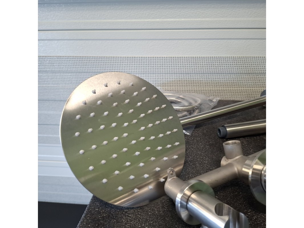 Product: Regendoucheset Kleur: rvs geborsteld Materiaal: rvs Afmeting: H.O.H. 150 mm Specificaties: inbouwdouchekraan, opbouwstang, regendouche 200mm met anti-kalk nozzles, staafhanddouche, verstelbare houder, doucheslang 150cm, alles in-én opbouwdelen